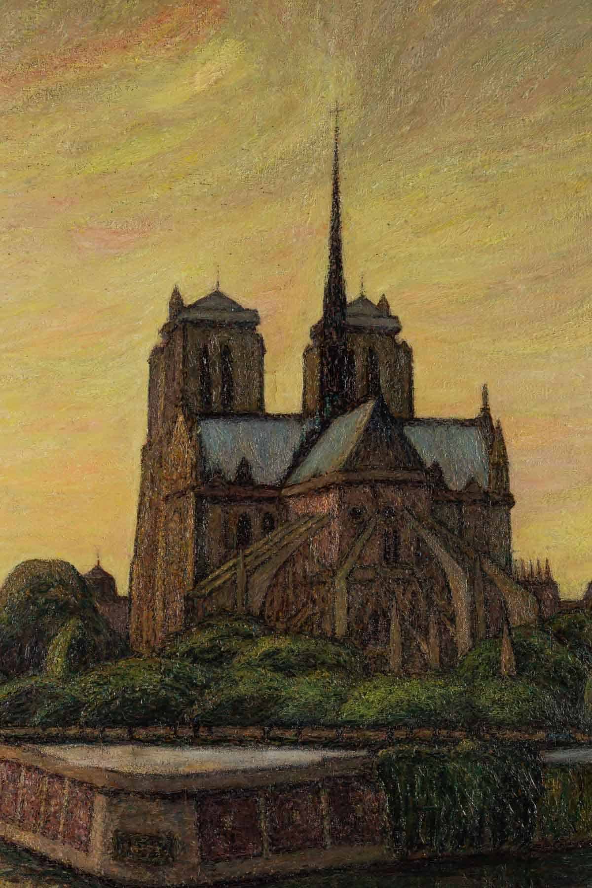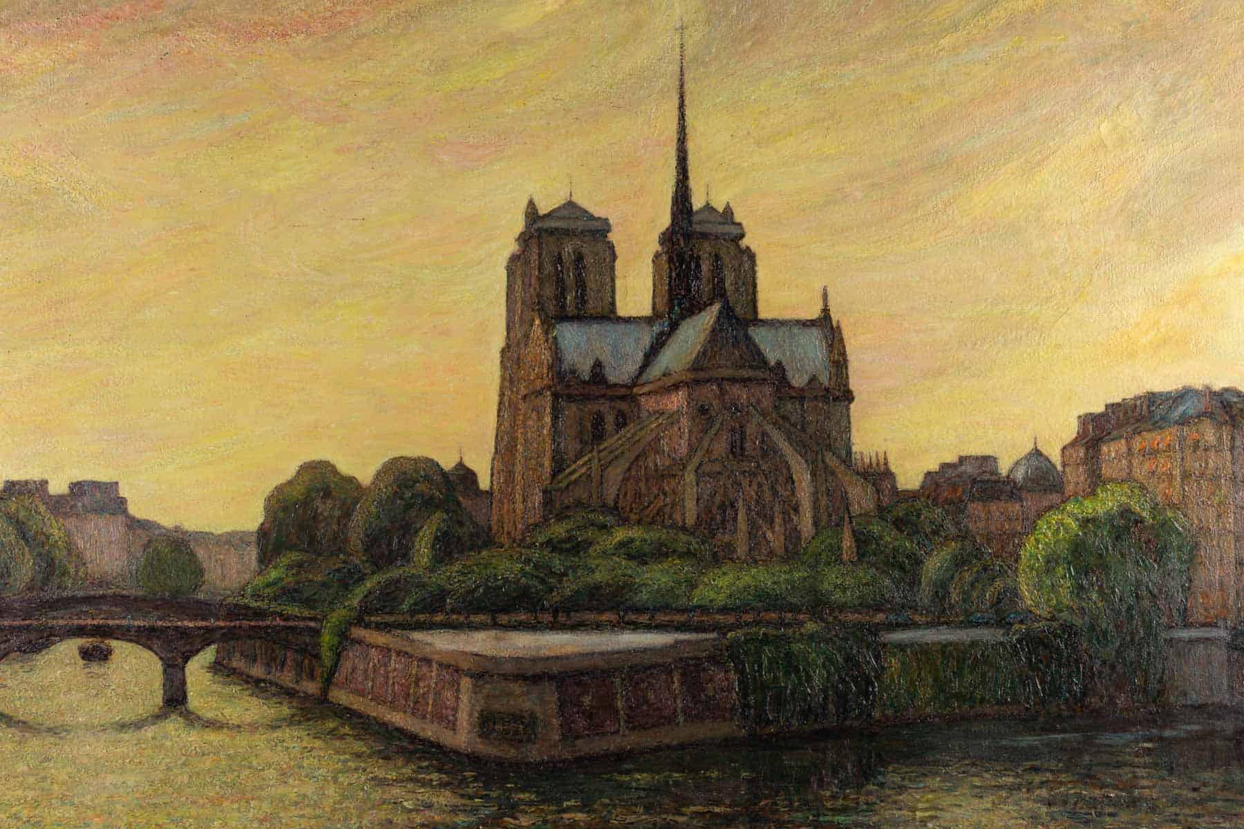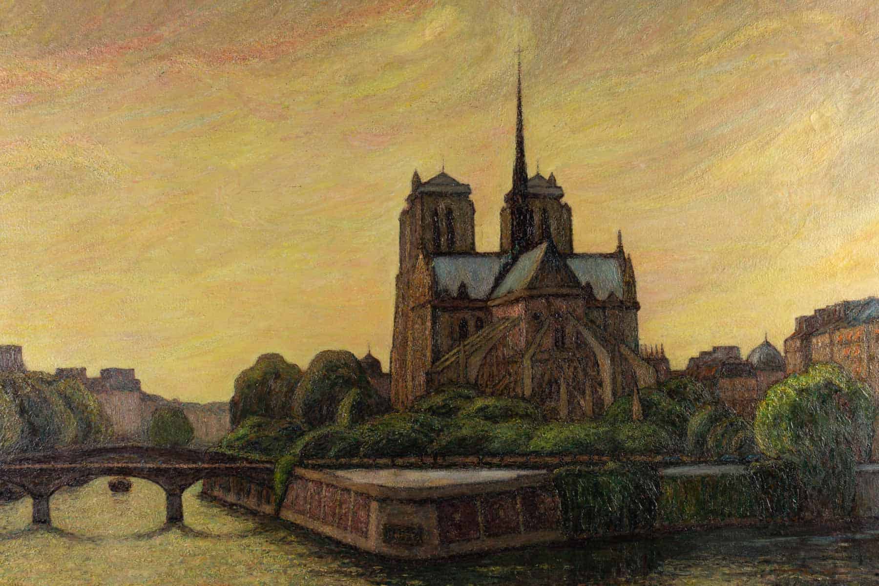 Une grande huile sur toile représentant Notre-Dame de Paris entre la Seine et la végétation.