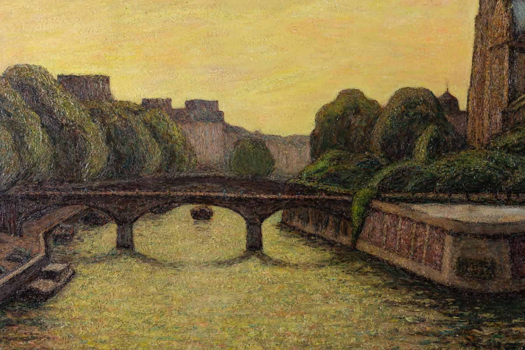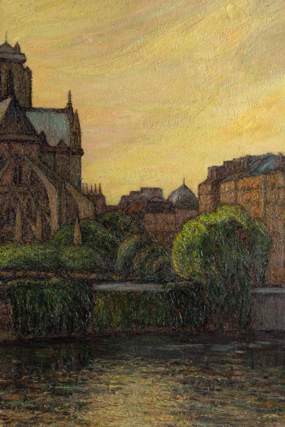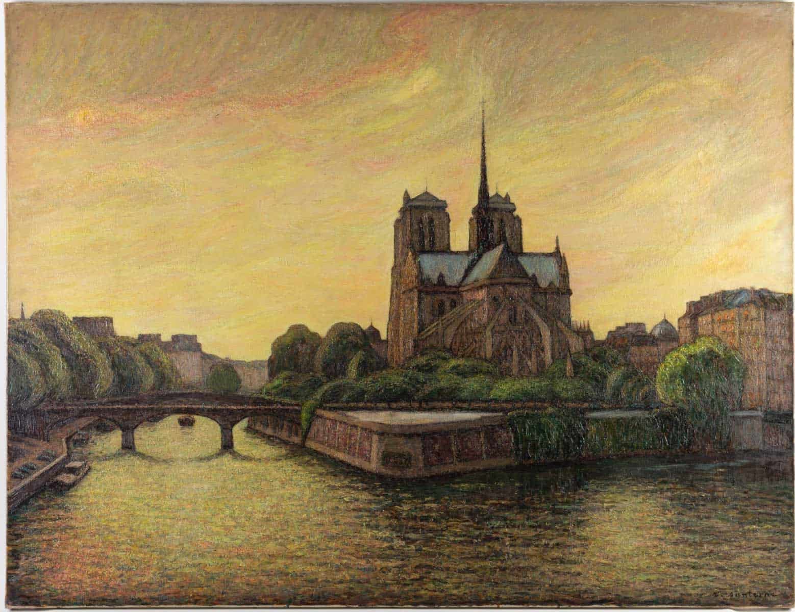 Une grande huile sur toile représentant Notre-Dame de Paris entre la Seine et la végétation.