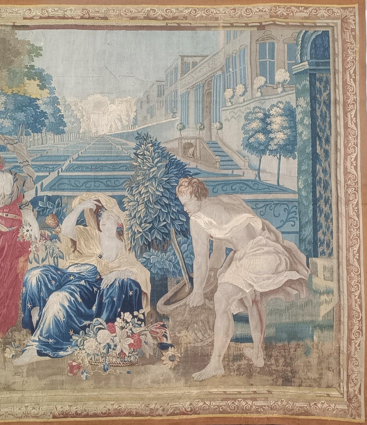 Importante tapisserie en laine et soie figurant l’allégories du jour et de la nuit avec deux vestales l’une cueillant les fleurs de l’aurore et l’autre laissant échapper de sa main les étoiles de la nuit, un génie jardinier apportant sur le côté un laurier dans un vase, le tout dans un riche Parc à la française, bordé d’une riche architecture symbolisant un escalier d’honneur d’un château.