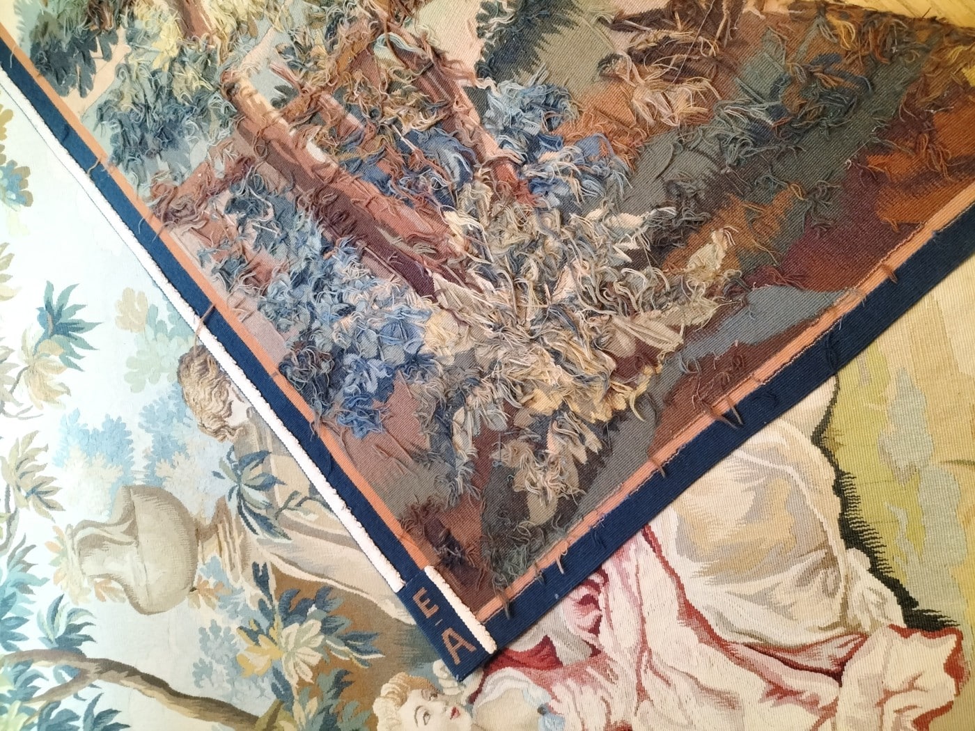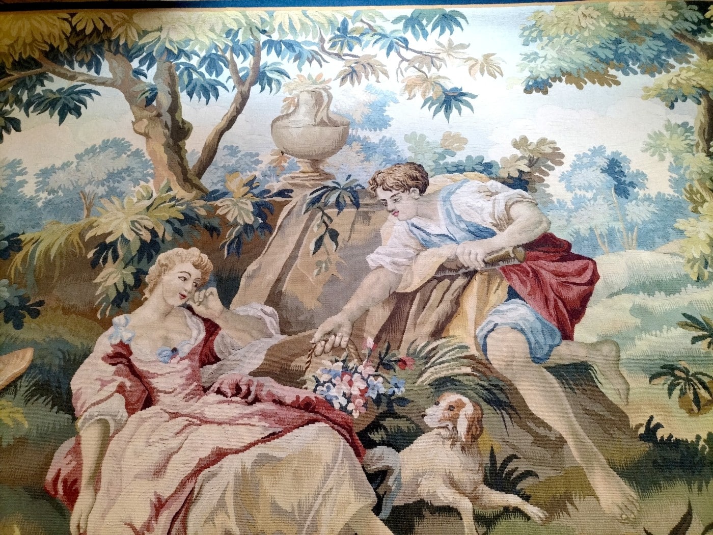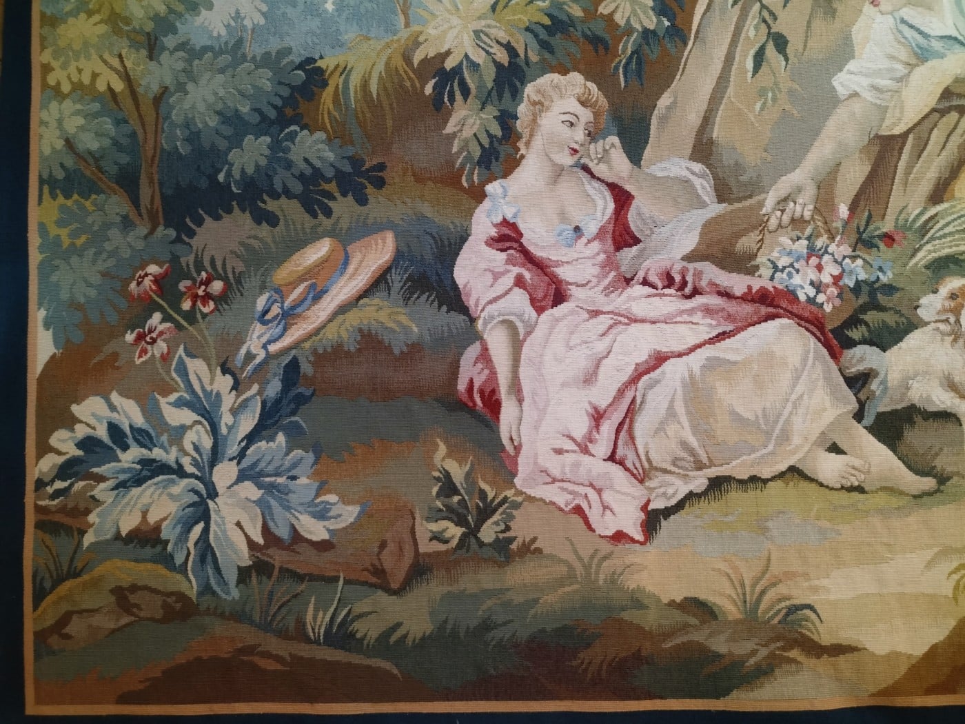 Tapisserie d’Aubusson tissé à la main en laine et soie représentant une scène galante d’après François Boucher.