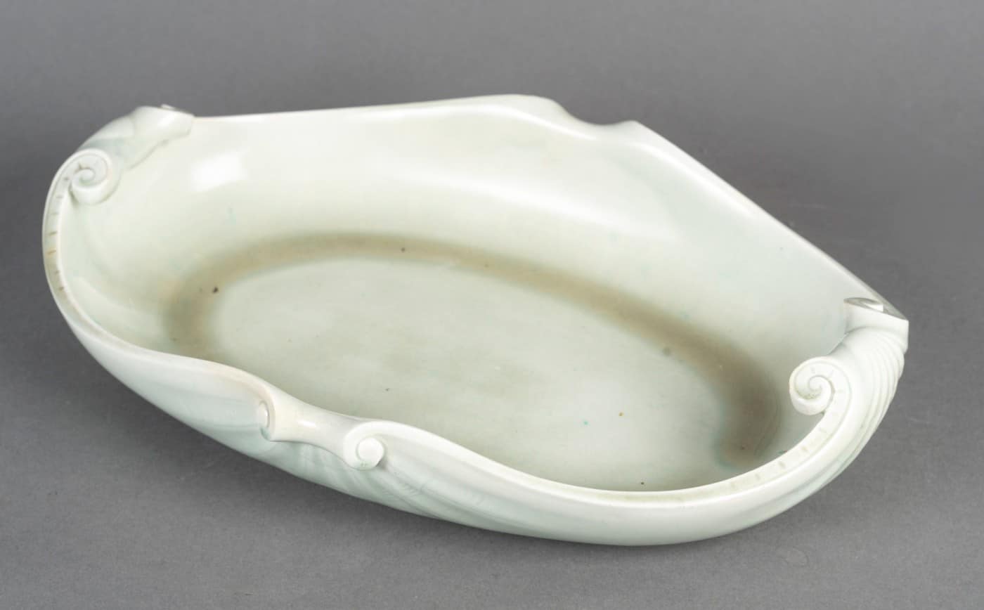 Faïence fine à émail monochrome céladon nuancé, à la surface satinée et subtilement irisée.