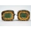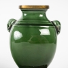 Paire de vases miniatures en faïence émaillée verte, à corps méplat, orné latéralement de petites têtes d’éléphants.