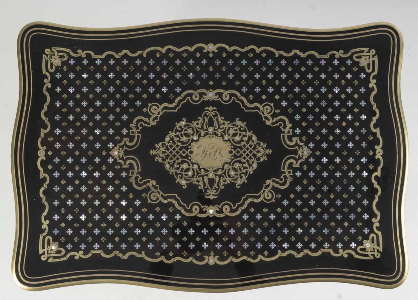 Le plateau supérieur, bordé d’un filet de laiton, présente en son centre un médaillon, encadré de réserves et monogrammé.