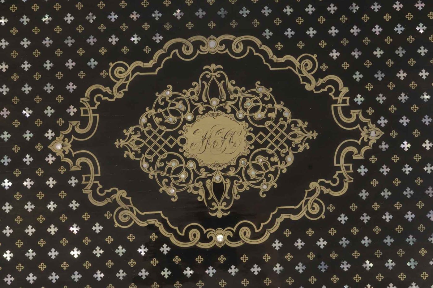 Le meuble est entièrement réalisé en bois noirci, orné sur toute ses faces d’une marqueterie dite “à la Reine”, composée d’un semis alterné de motifs quadrilobés en laiton finement découpé et nacre naturelle, soigneusement incrustés et parfaitement alignés.