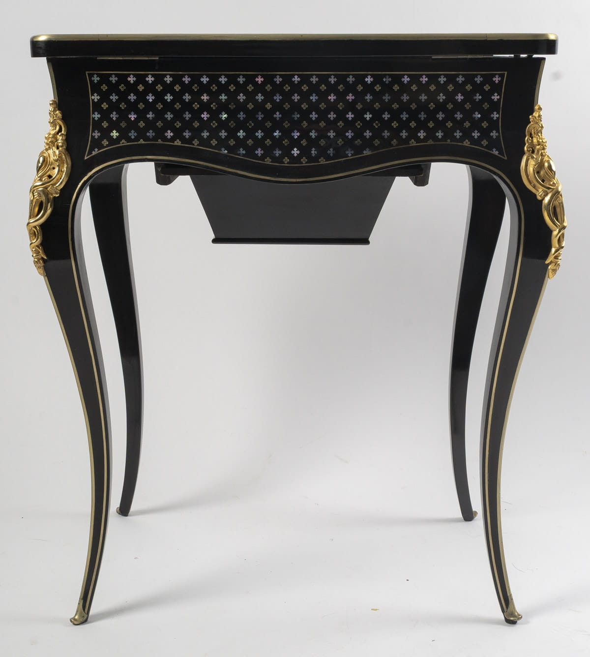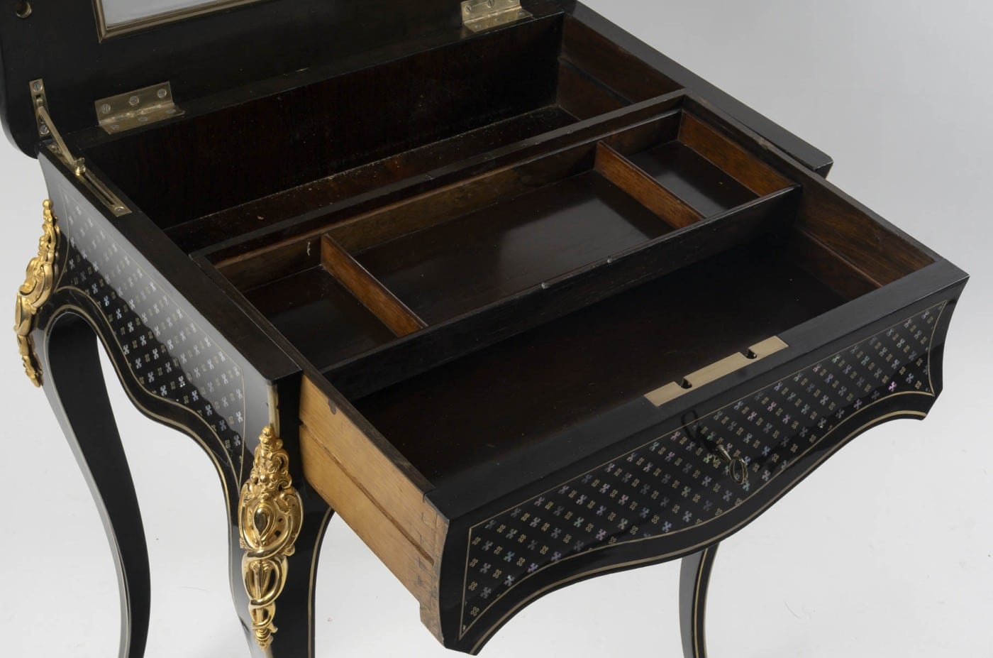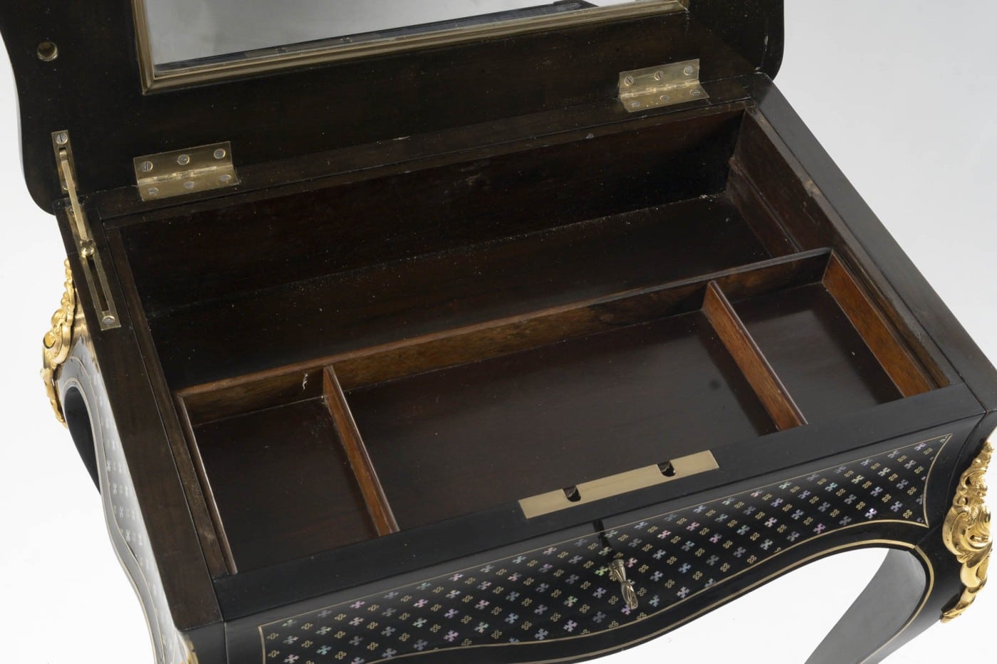Travailleuse coiffeuse d’époque Napoléon III, de forme rectangulaire aux angles adoucis et contours chantournés, reposant sur quatre pieds galbés élégamment cambrés, typiques du répertoire Louis XV revisité au XIXᵉ siècle.