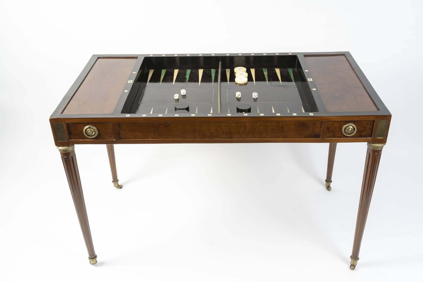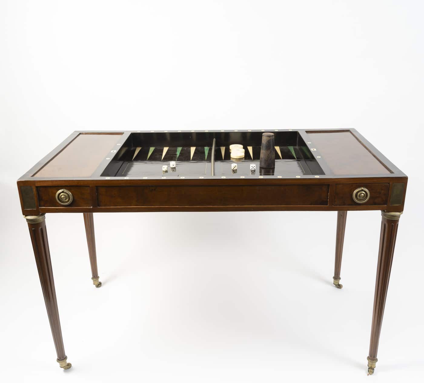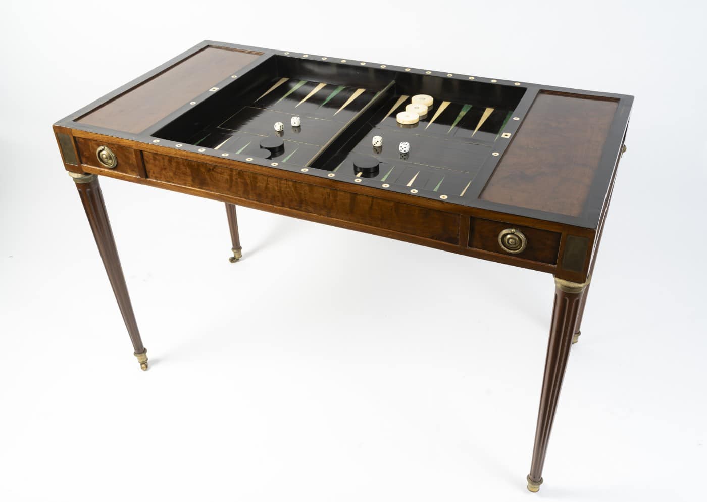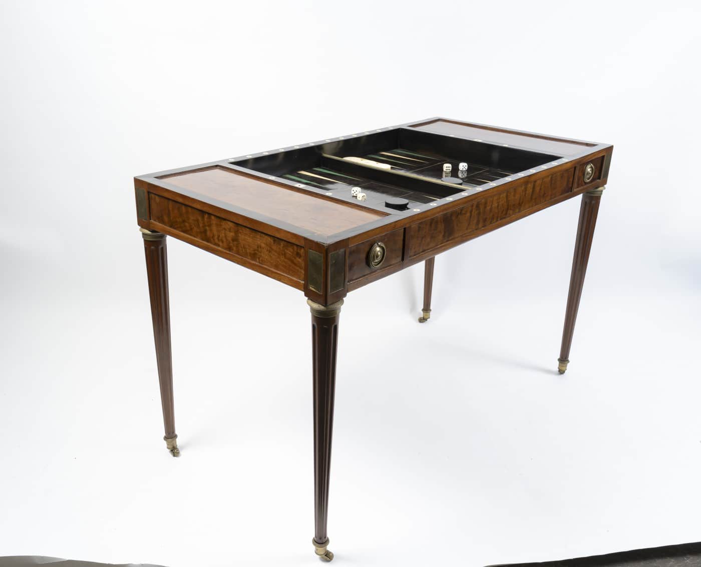 Il est garni en ceinture et aux angles de plaques en laiton doré et de deux tiroirs ouvrant chacun d’un côté. Il possède tous ses jetons d’origine, son gobelet en cuir pour une partie de backgammon. Les pieds cannelés sont ornés de gaines en bronze doré en partie haute et reposent sur des sabots munis de roulettes également en bronze. Le plateau amovible comporte une face recouverte d’un feutre vert et l’autre garnie d’un cuir brum formant un bureau une fois fermé. Son bâti est en chêne.
