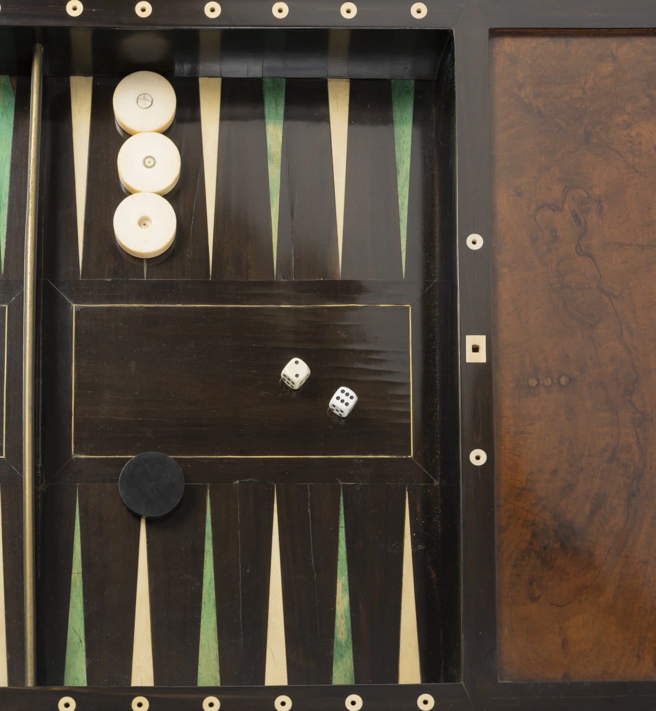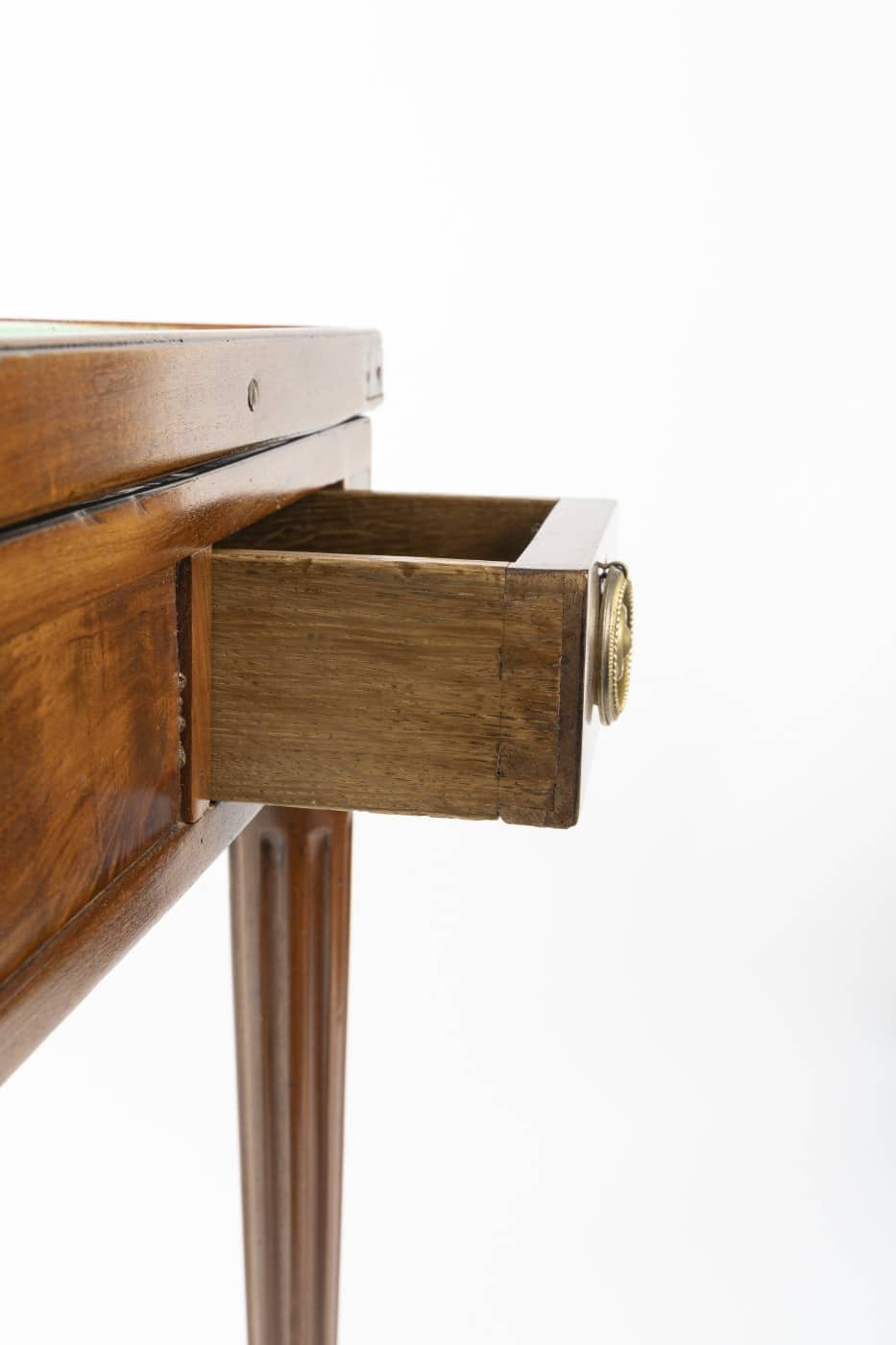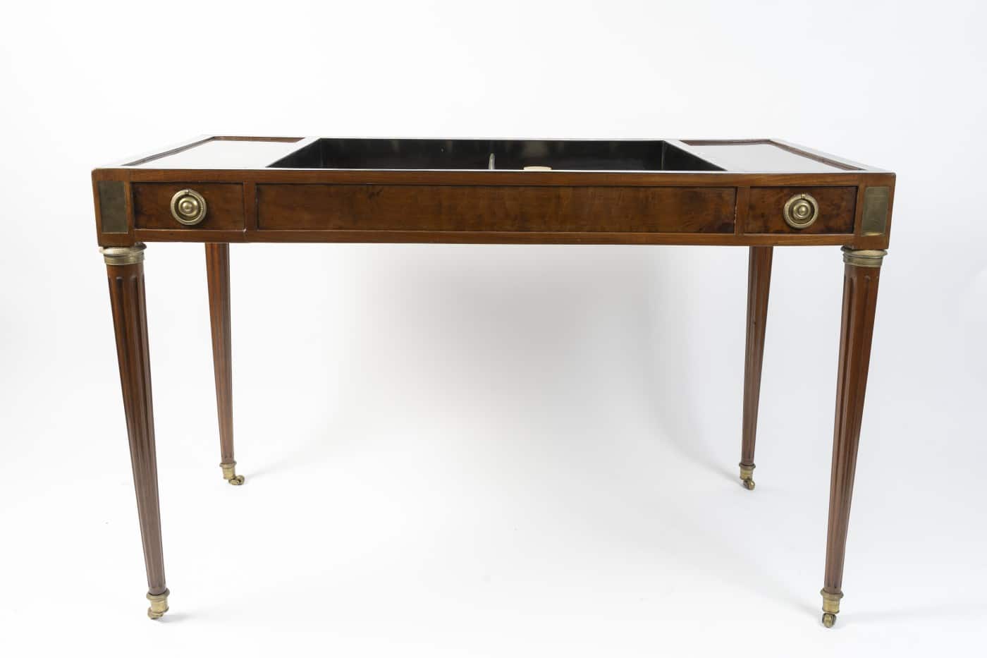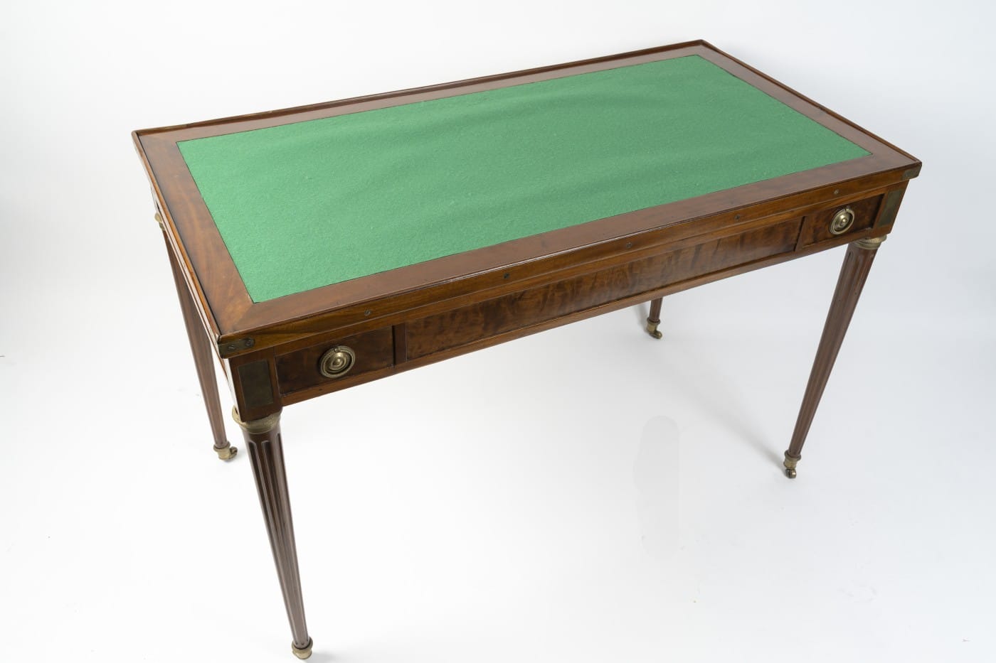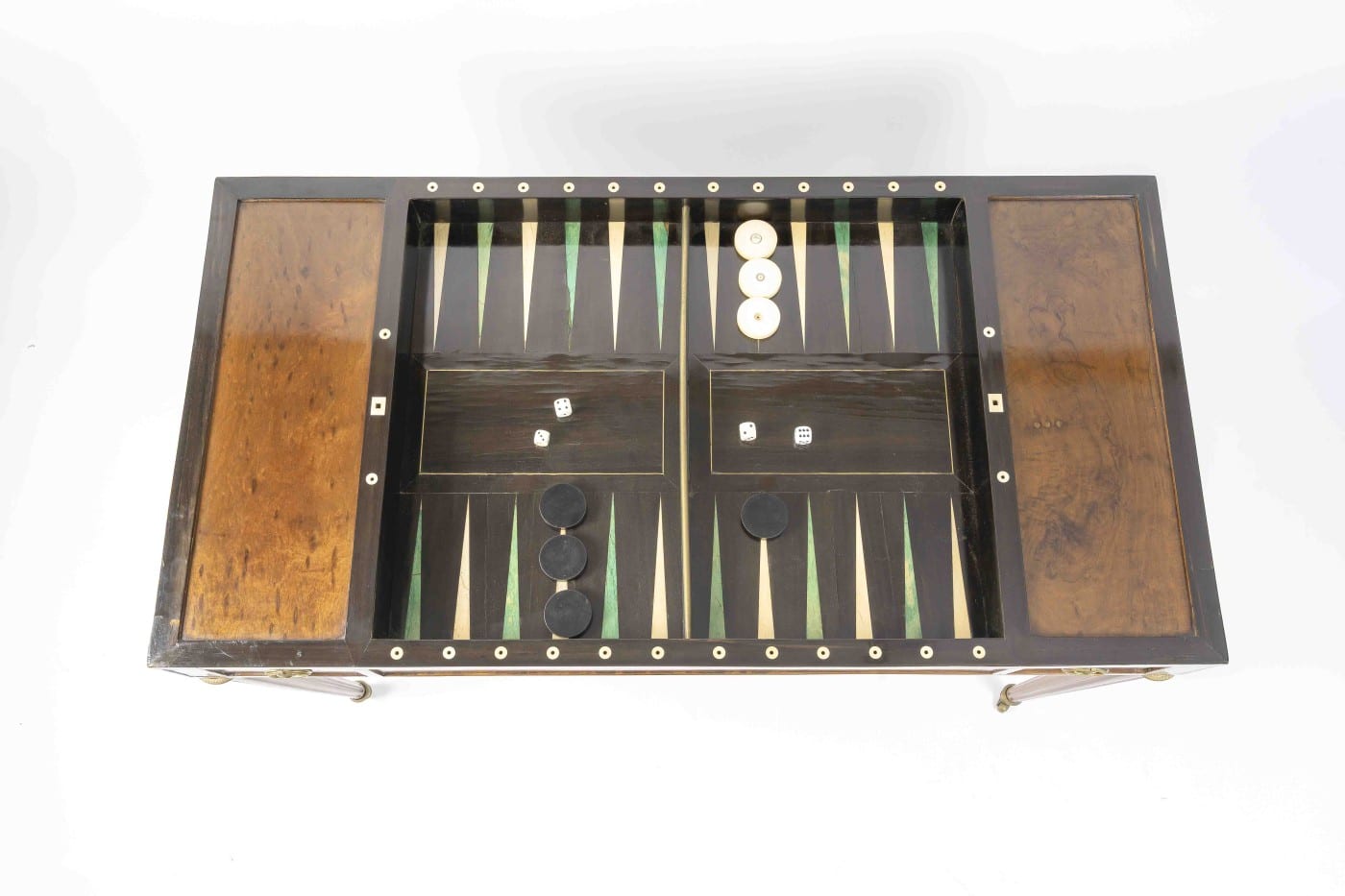 Il est garni en ceinture et aux angles de plaques en laiton doré et de deux tiroirs ouvrant chacun d’un côté. Il possède tous ses jetons d’origine, son gobelet en cuir pour une partie de backgammon. Les pieds cannelés sont ornés de gaines en bronze doré en partie haute et reposent sur des sabots munis de roulettes également en bronze. Le plateau amovible comporte une face recouverte d’un feutre vert et l’autre garnie d’un cuir brum formant un bureau une fois fermé. Son bâti est en chêne.