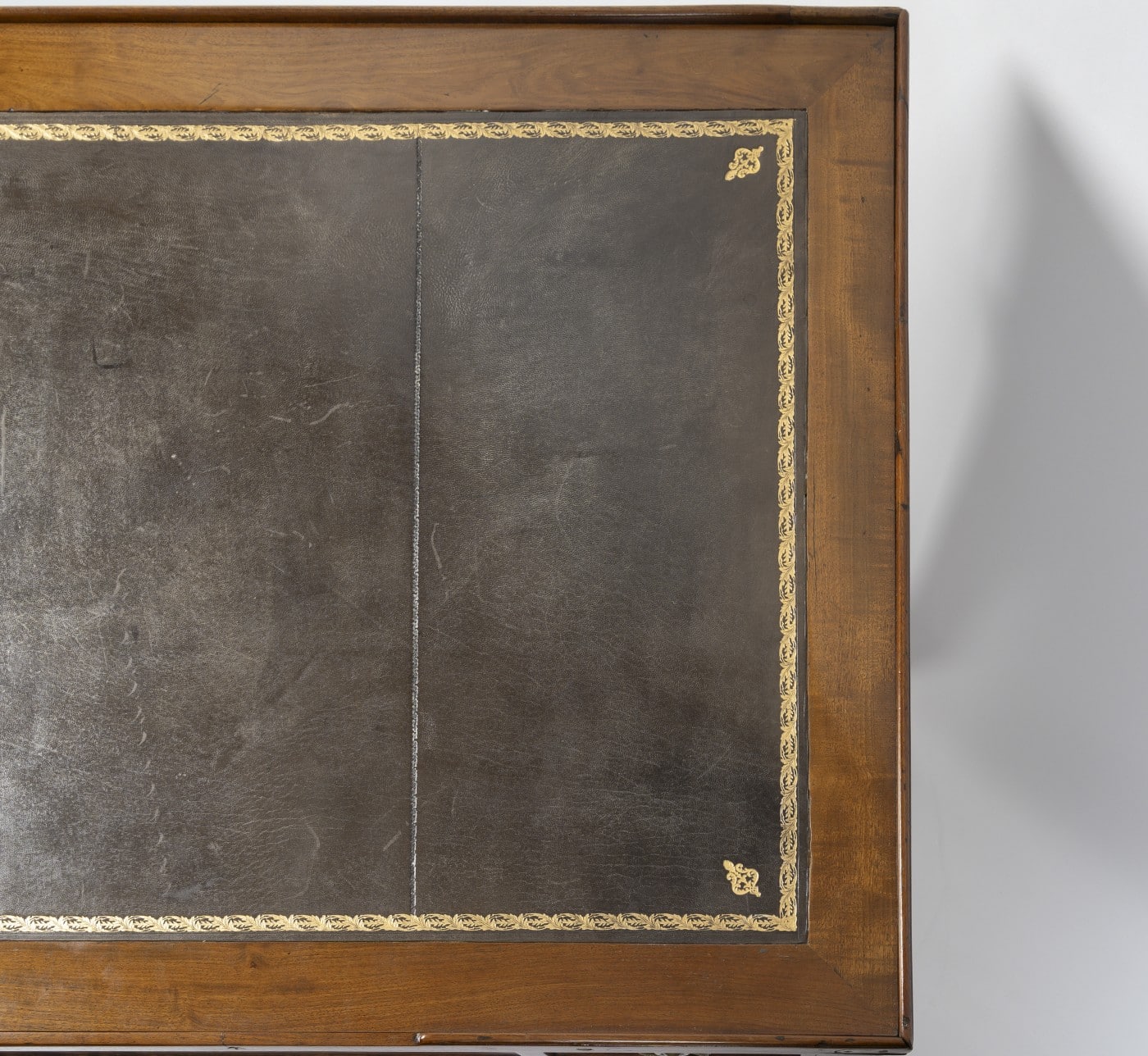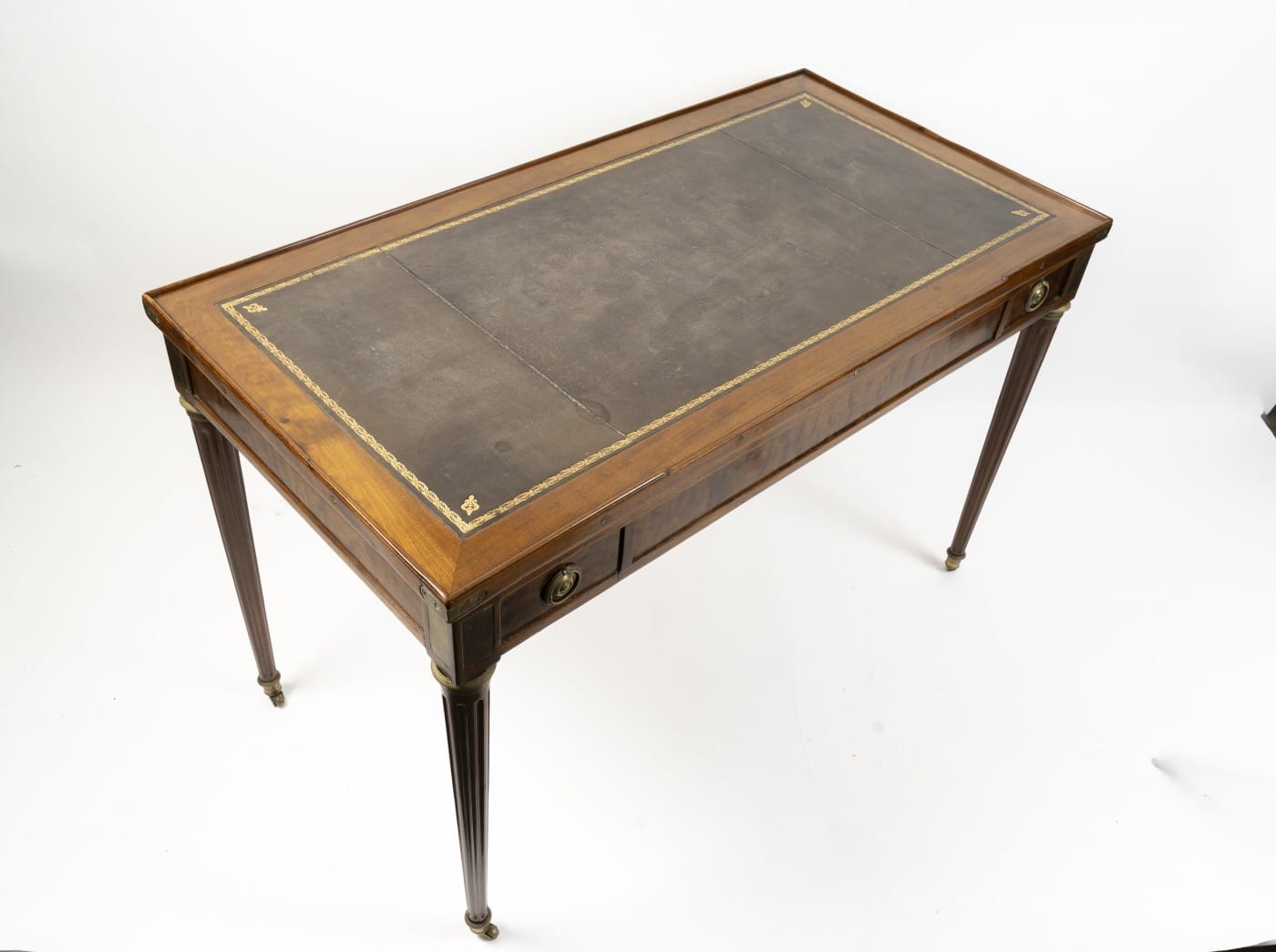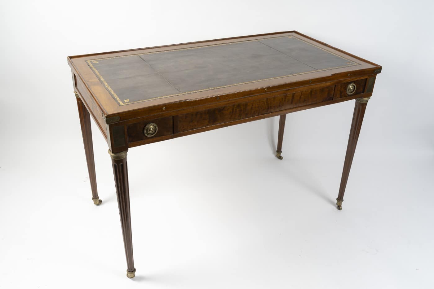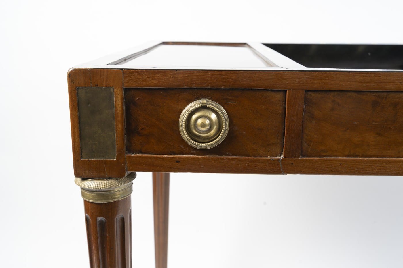 Il est garni en ceinture et aux angles de plaques en laiton doré et de deux tiroirs ouvrant chacun d’un côté. Il possède tous ses jetons d’origine, son gobelet en cuir pour une partie de backgammon. Les pieds cannelés sont ornés de gaines en bronze doré en partie haute et reposent sur des sabots munis de roulettes également en bronze. Le plateau amovible comporte une face recouverte d’un feutre vert et l’autre garnie d’un cuir brum formant un bureau une fois fermé. Son bâti est en chêne.