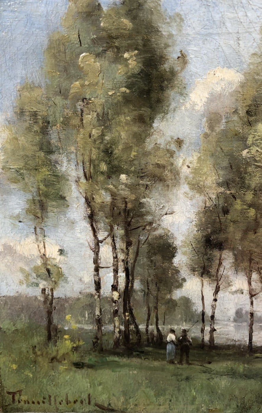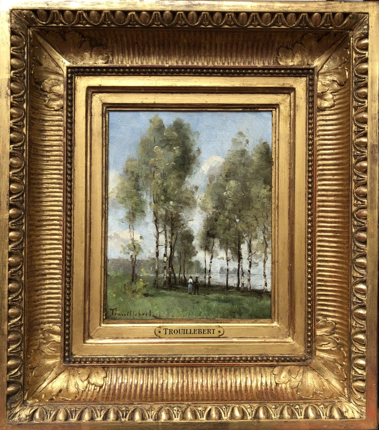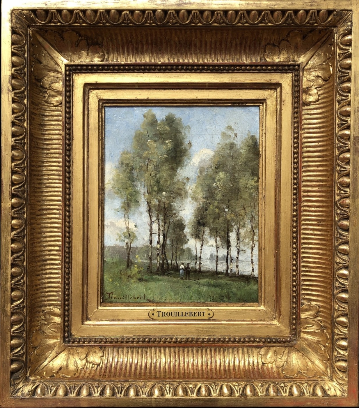 Peintre de genre, figures, nus, portraits, paysages –Elève de Hebert et Jallabert, Paul Désiré TROUILLEBERT débute honorablement une carrière de portraitiste, mais sa rencontre avec Corot le convertit si bien au paysage sur nature qu’il ne vit plus désormais que dans l’orbite du maître de Ville-d’Avray, orientant presque exclusivement ses recherches sur le plein air et le rendu de l’atmosphère – Avec franchise, Paul Désiré TROUILLEBERT s’inspirera toute sa vie des mêmes thèmes que Corot : les bords de l’eau au matin et au soleil couchant, les étangs dans la campagne, les arbres et les bois sont autant de sujets qui ne cessent de le séduire – D’un pinceau qui ne manque ni de légèreté, ni de transparence, Paul Désiré TROUILLEBERT s’applique à traduire, dans la gamme grise de son aîné, les valeurs lumineuses et atmosphériques de la nature – Ses peintures ont eu un vif succès auprès du public et conserve un attrait constant -Paul Désiré TROUILLEBERT expose au Salon à partir de 1865