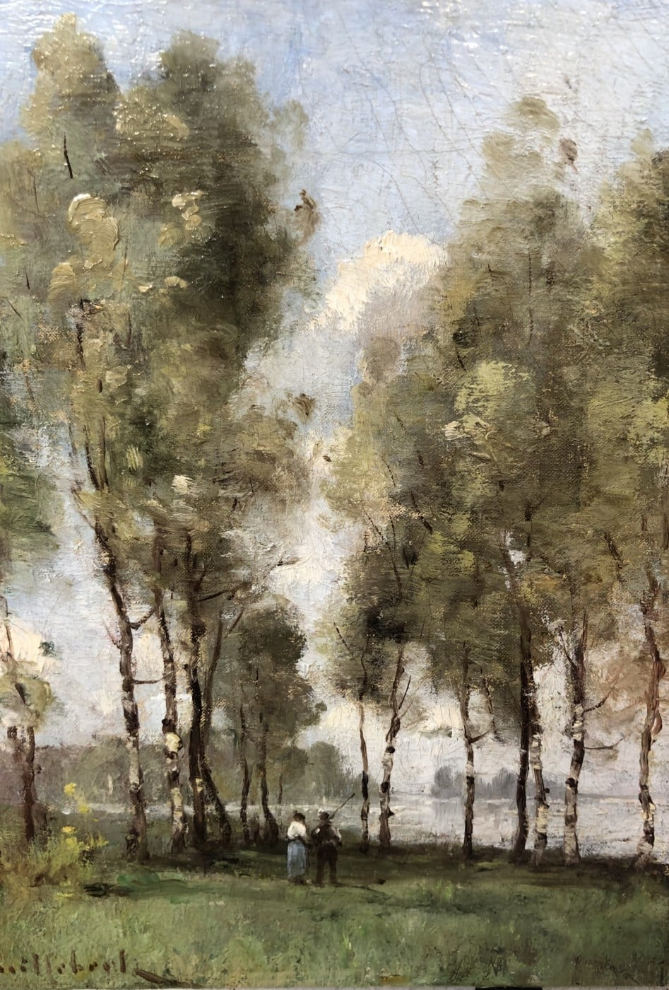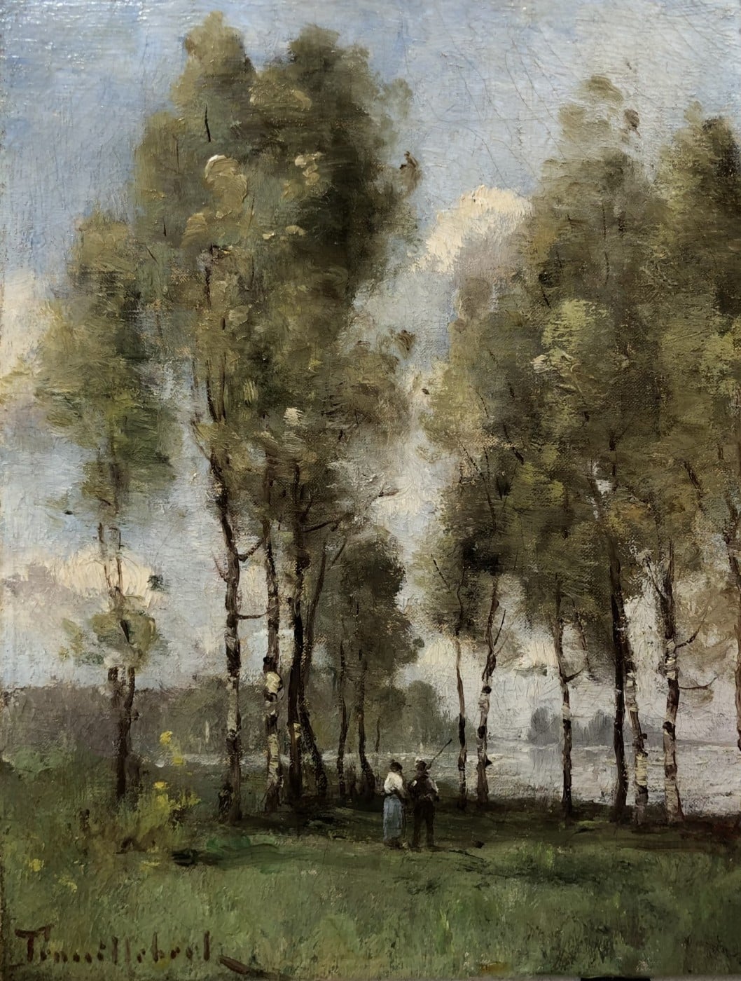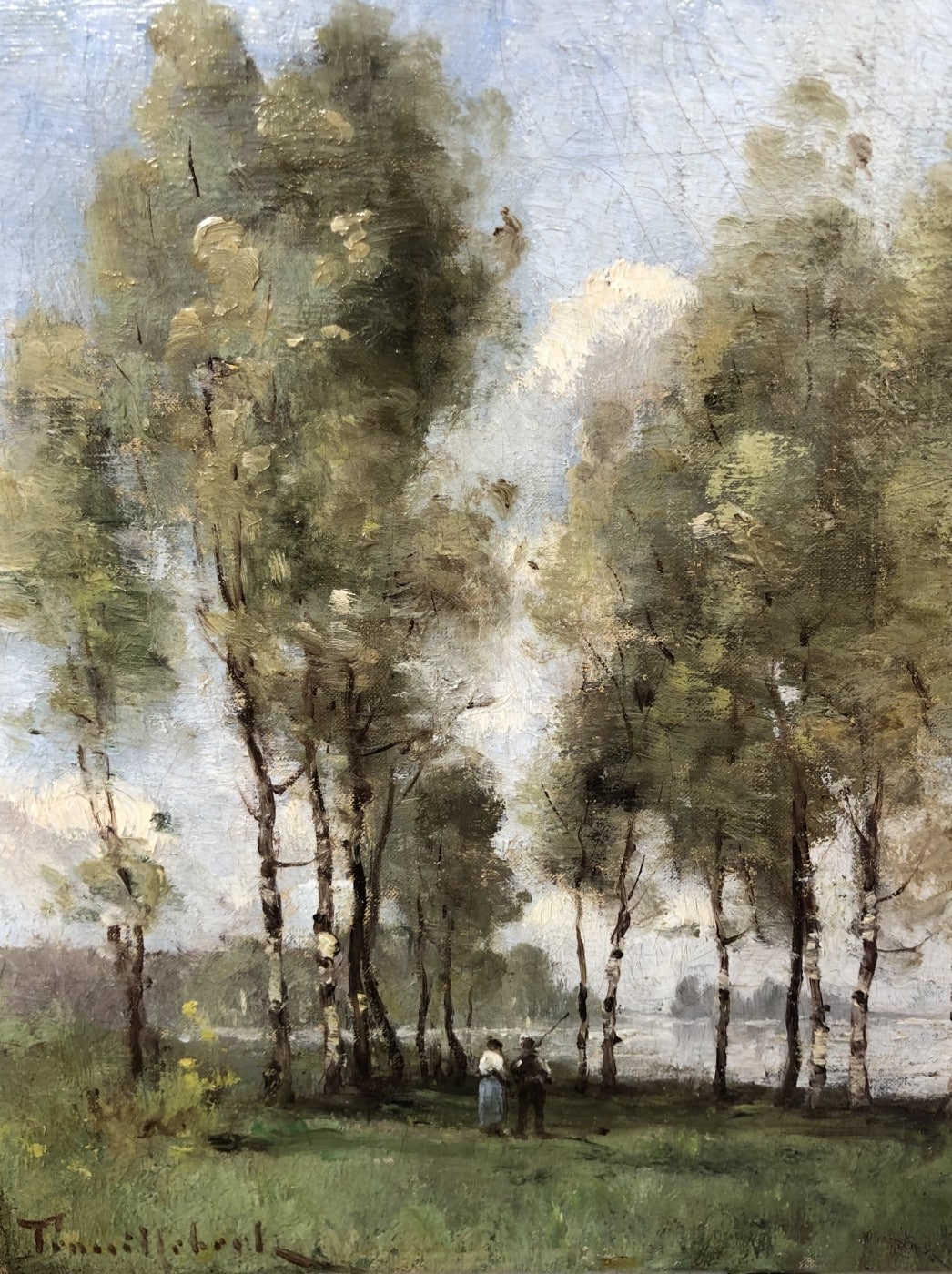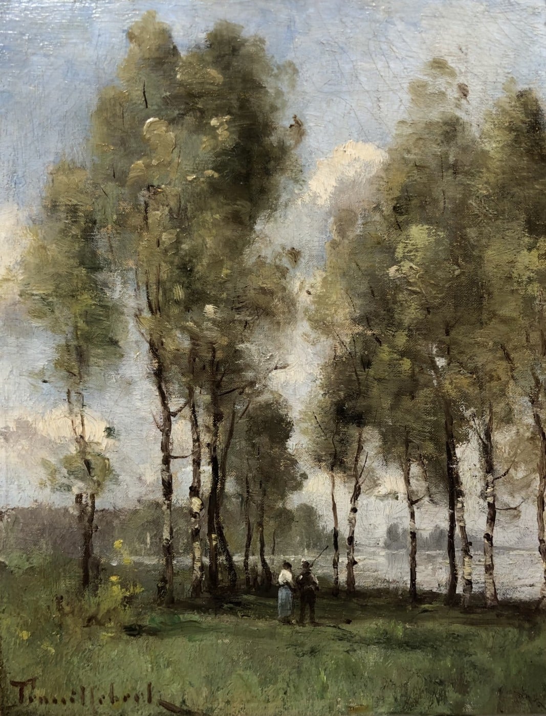Peintre de genre, figures, nus, portraits, paysages –Elève de Hebert et Jallabert, Paul Désiré TROUILLEBERT débute honorablement une carrière de portraitiste, mais sa rencontre avec Corot le convertit si bien au paysage sur nature qu’il ne vit plus désormais que dans l’orbite du maître de Ville-d’Avray, orientant presque exclusivement ses recherches sur le plein air et le rendu de l’atmosphère – Avec franchise, Paul Désiré TROUILLEBERT s’inspirera toute sa vie des mêmes thèmes que Corot : les bords de l’eau au matin et au soleil couchant, les étangs dans la campagne, les arbres et les bois sont autant de sujets qui ne cessent de le séduire – D’un pinceau qui ne manque ni de légèreté, ni de transparence, Paul Désiré TROUILLEBERT s’applique à traduire, dans la gamme grise de son aîné, les valeurs lumineuses et atmosphériques de la nature – Ses peintures ont eu un vif succès auprès du public et conserve un attrait constant -Paul Désiré TROUILLEBERT expose au Salon à partir de 1865