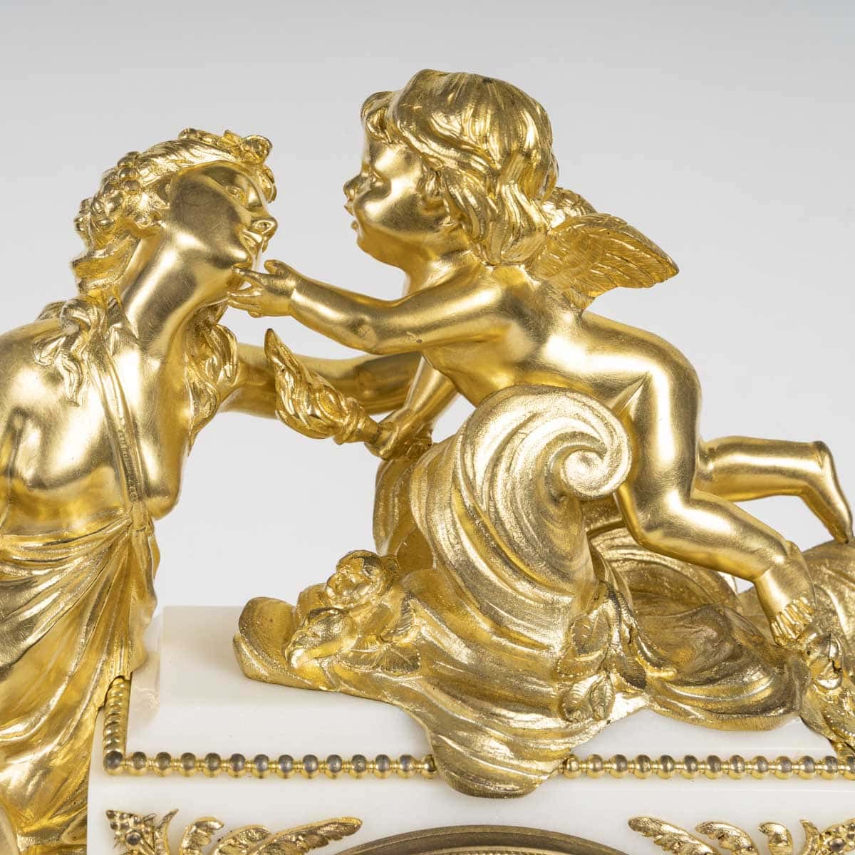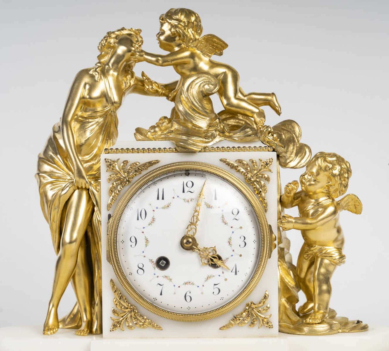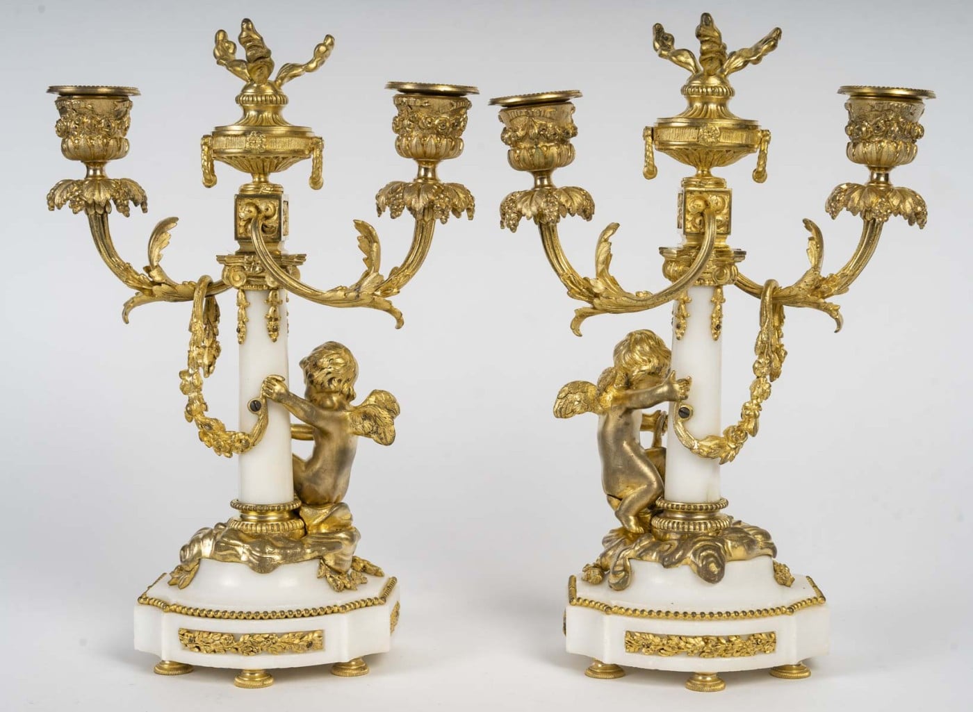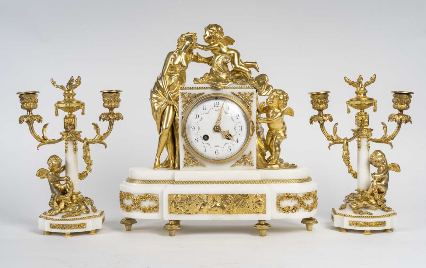 Une belle garniture en bronze doré et marbre blanc de style louis XVI