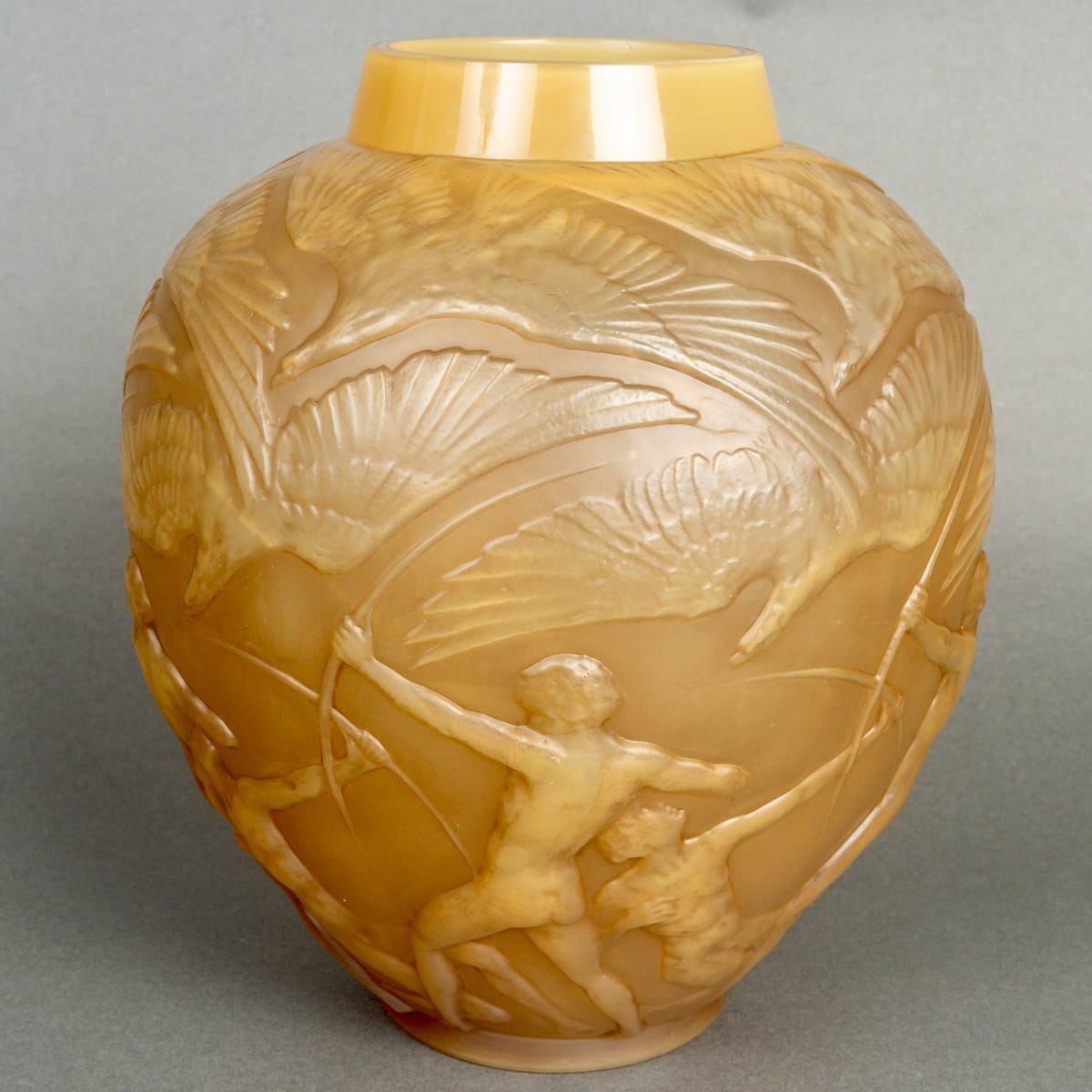 Vase « Archers » en verre butterscotch patiné sépia de René Lalique créé en 1921.
