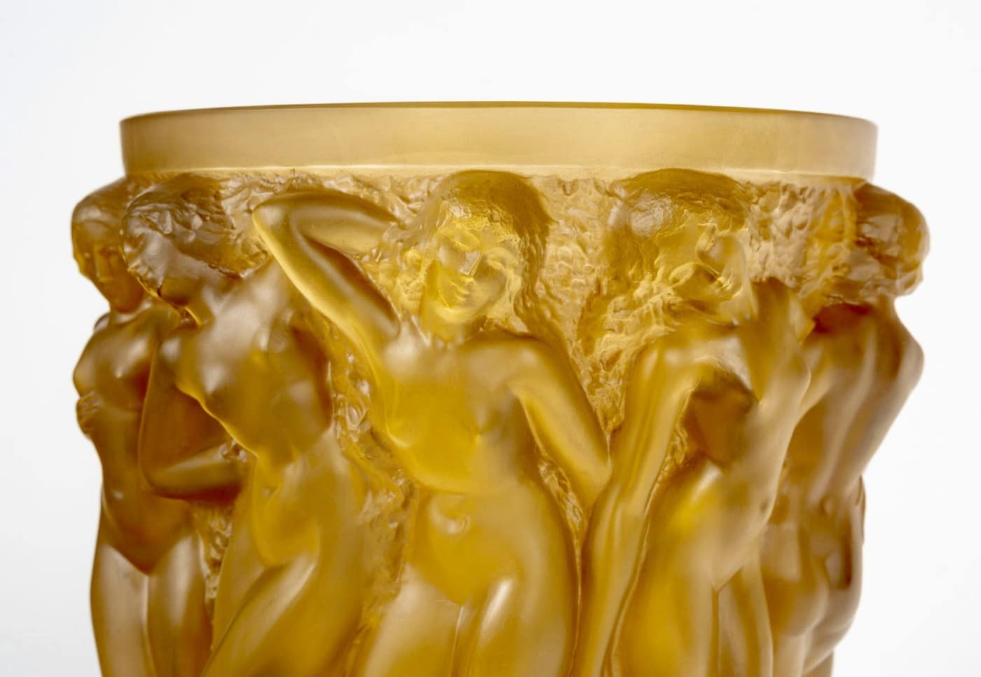 Vase « Bacchantes » en verre jaune ambré patiné sépia de René Lalique créé en 1927.