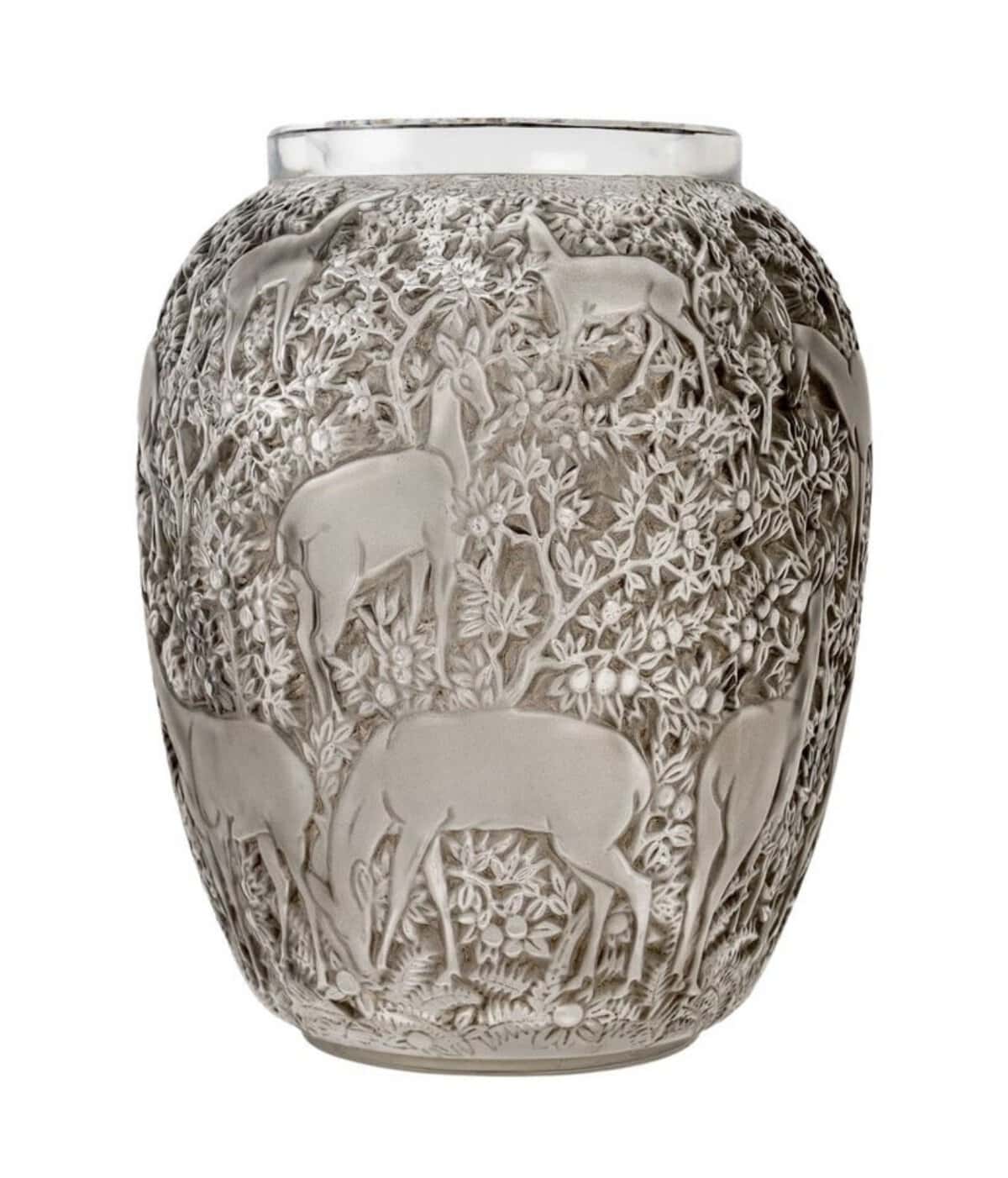 Vase « Biches » en verre blanc patiné gris de René Lalique créé en 1931.
