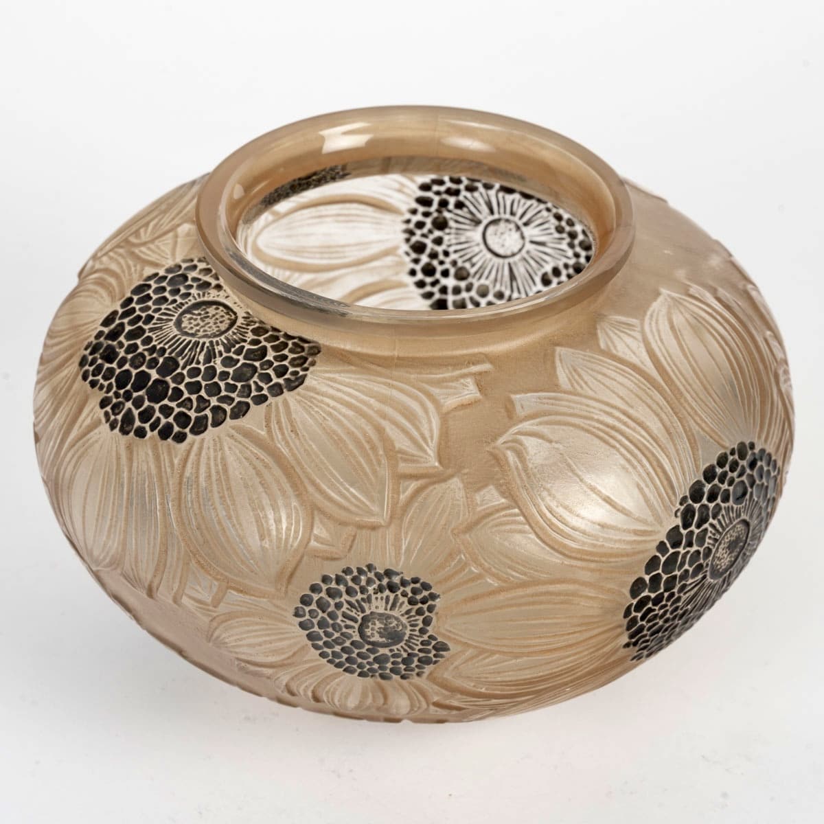 Vase « Dahlias » verre blanc patiné sépia et émaillé noir de René LALIQUE