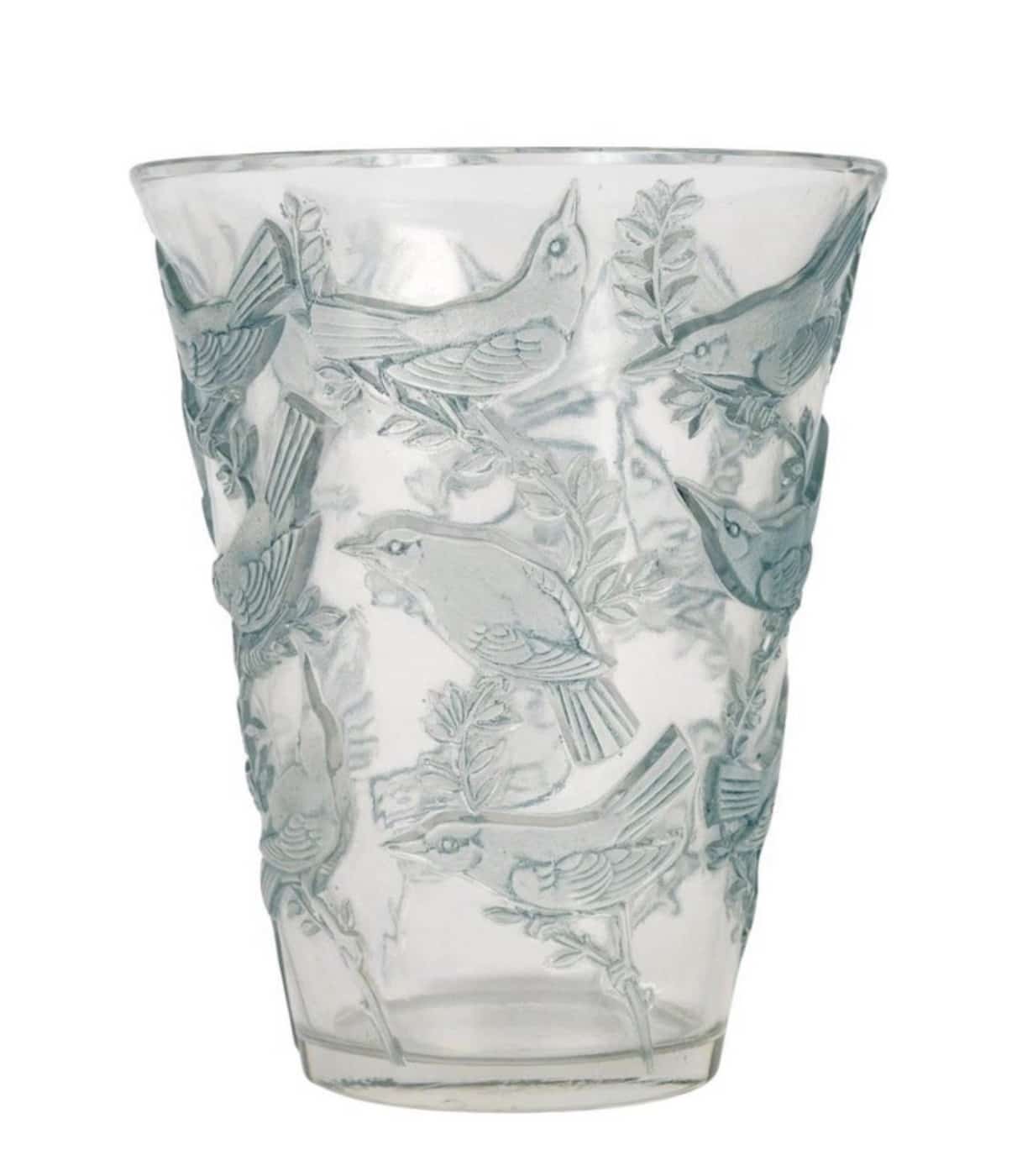Vase « Grives » en verre blanc patiné bleu de René Lalique créé en 1938.