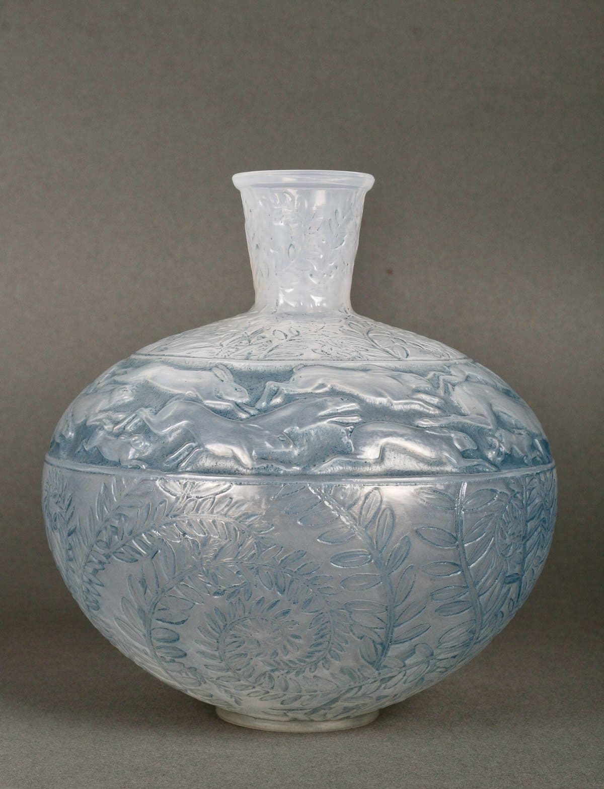 Vase « Lièvres » en verre opalescent double couche patiné bleu de René Lalique créé en 1923.