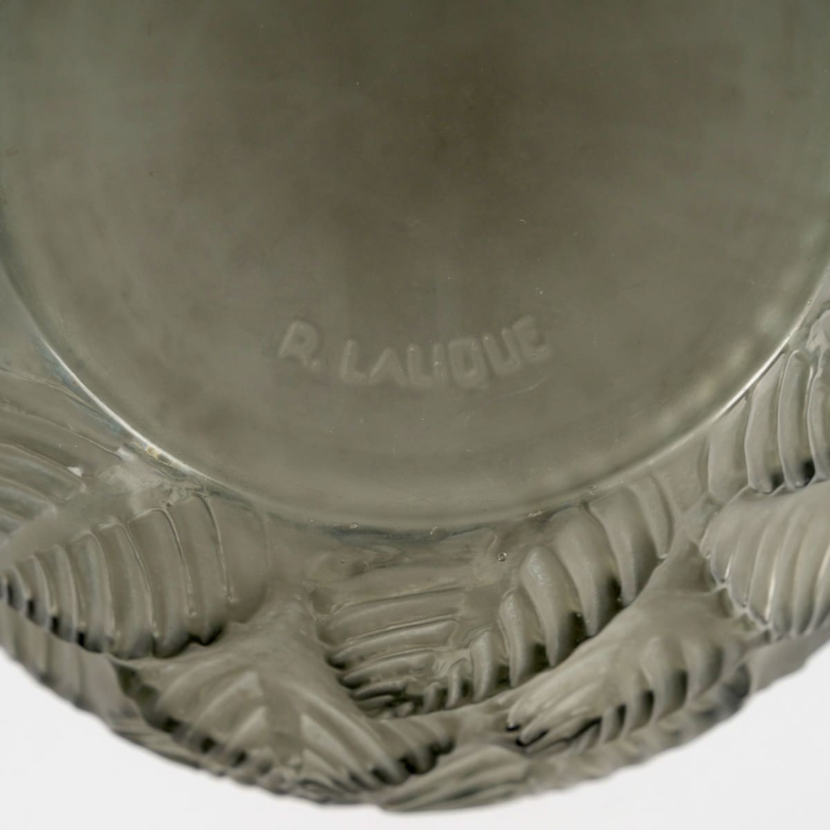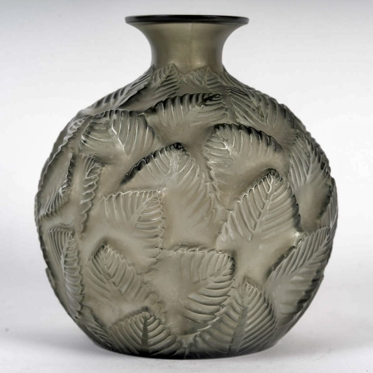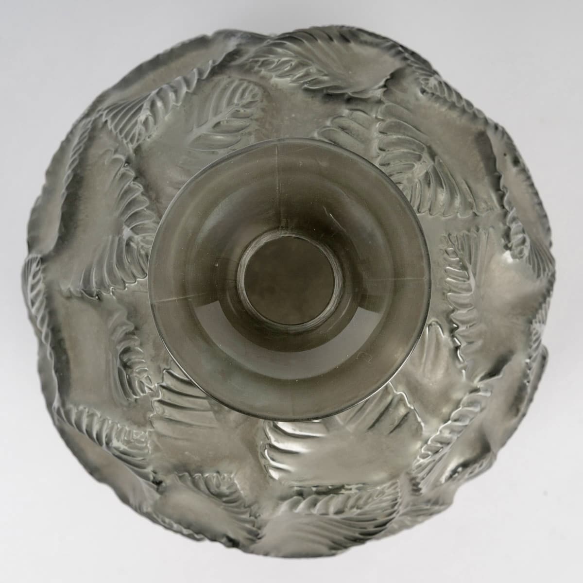 Vase « Ormeaux » en verre gris patiné blanc de René Lalique créé en 1926.