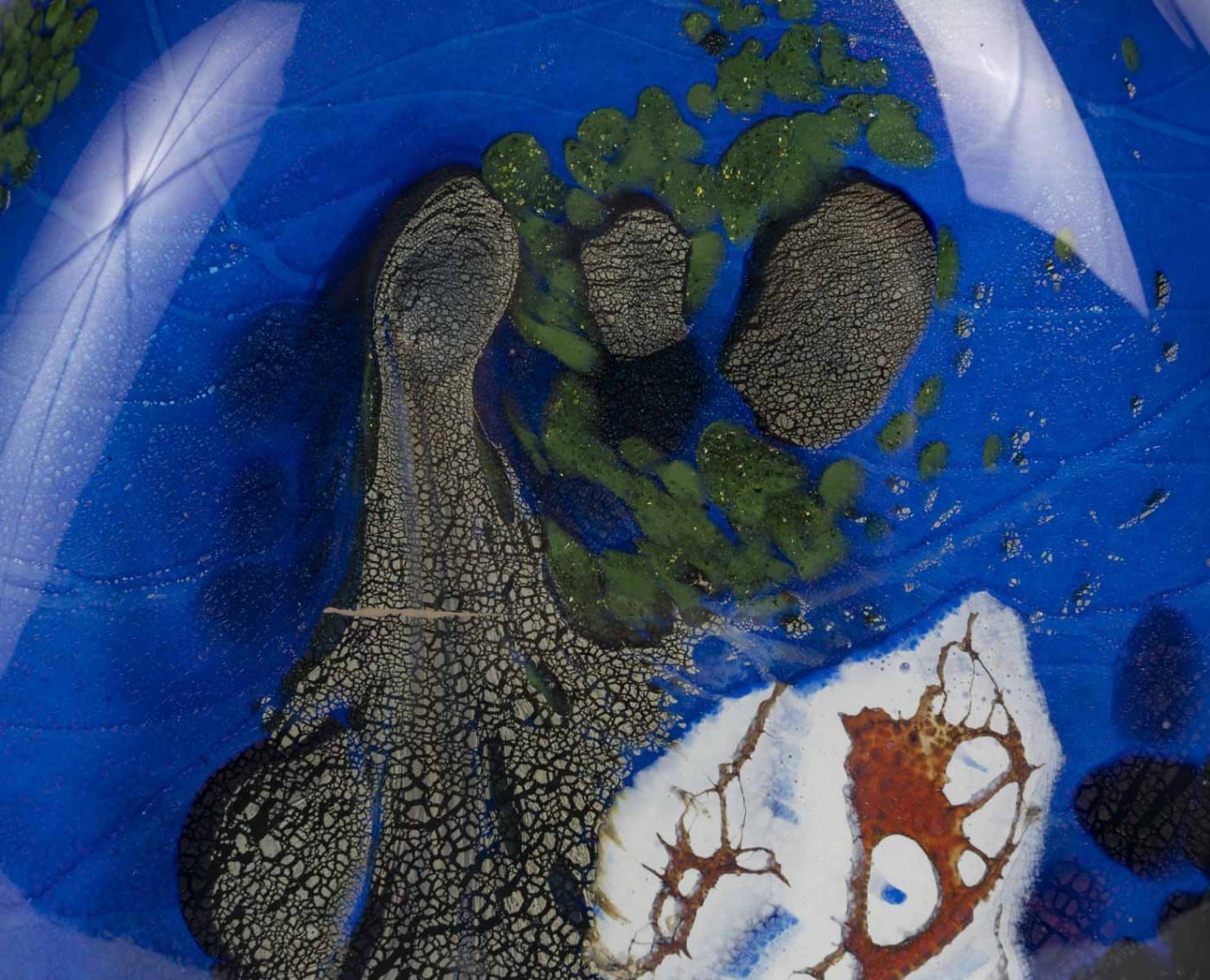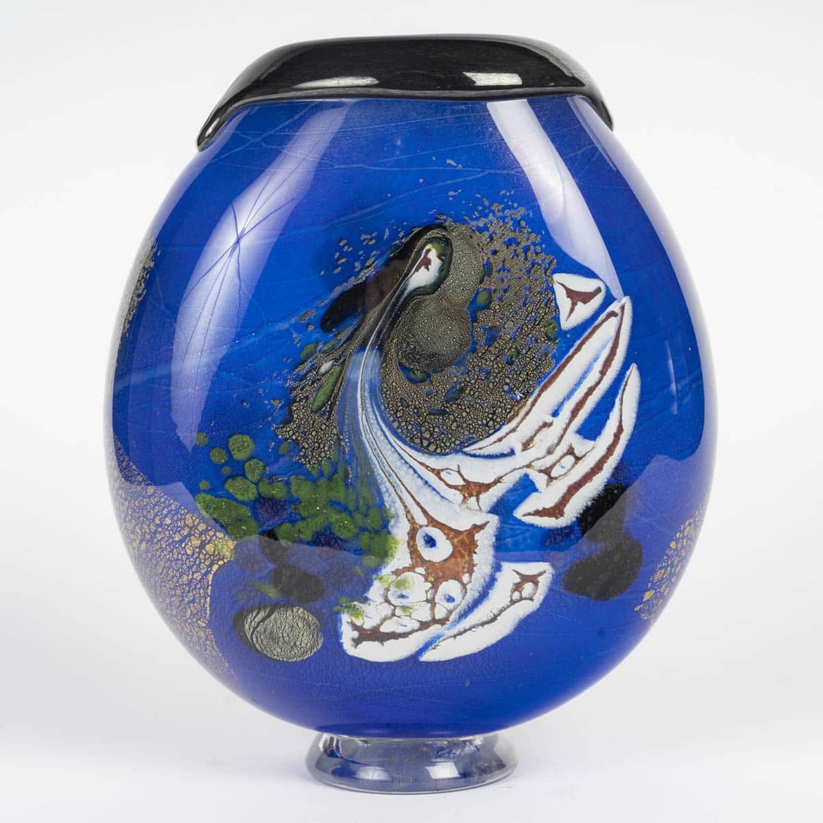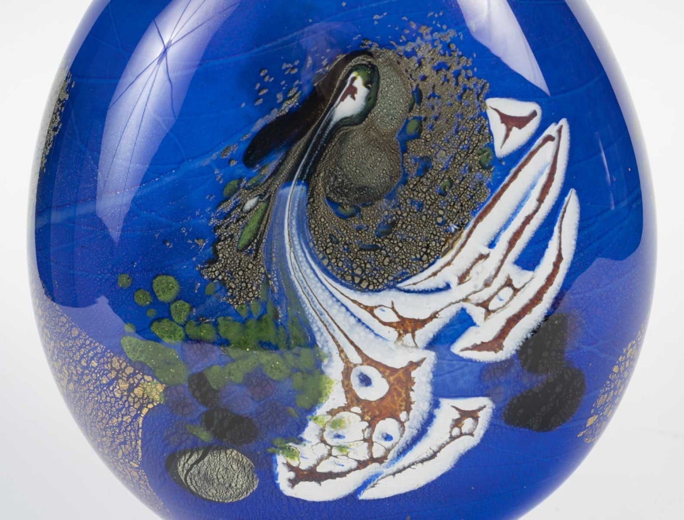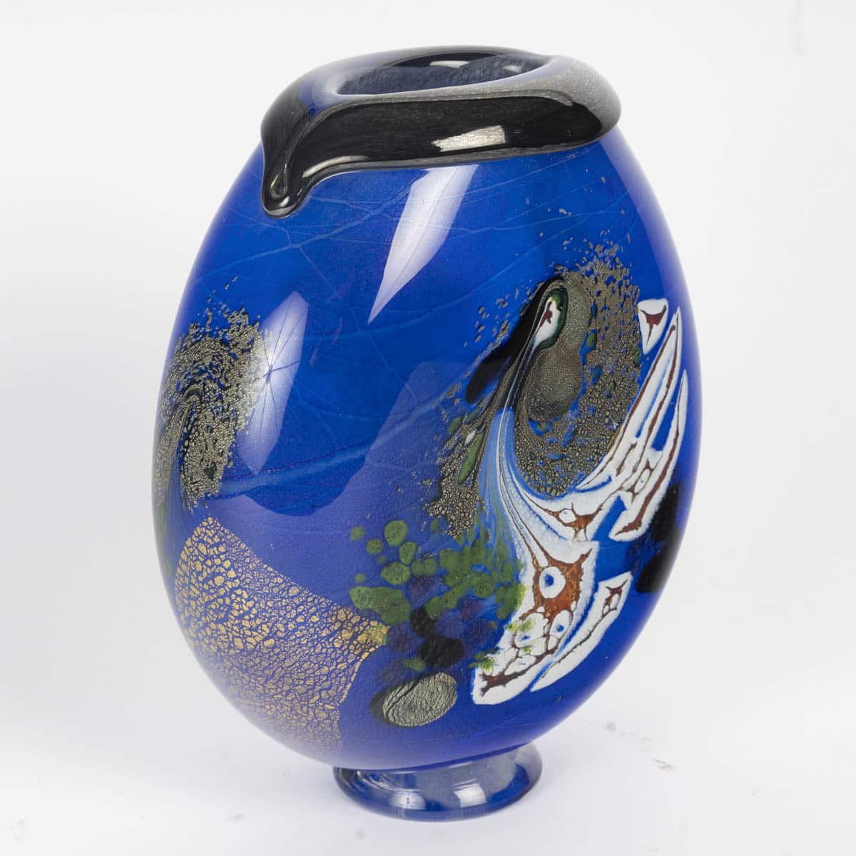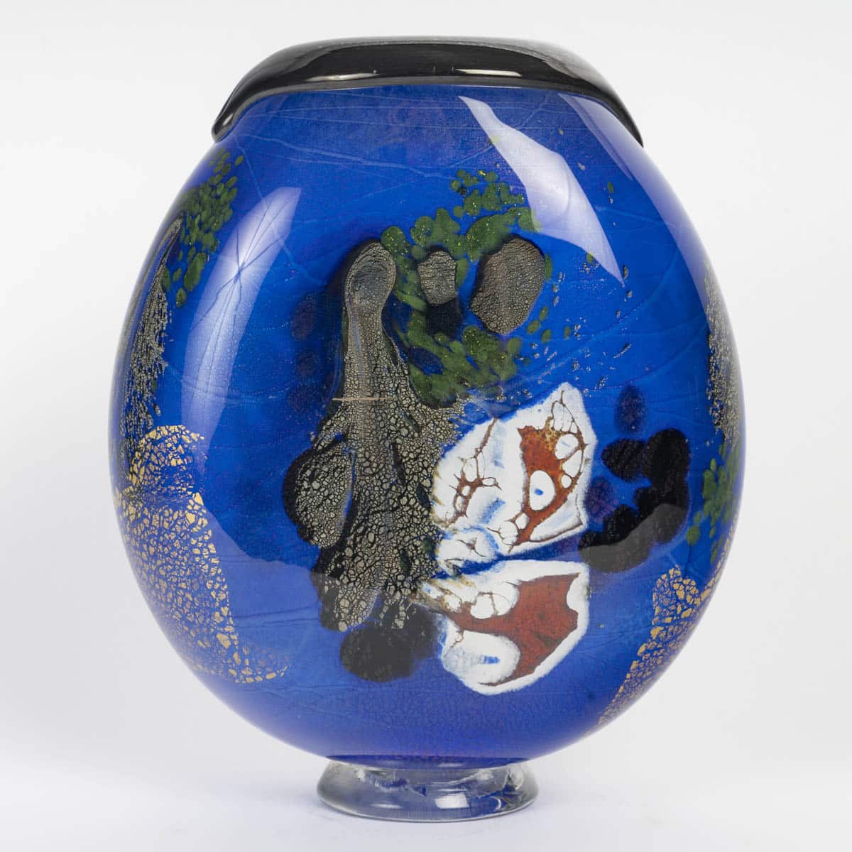 Vase ovoïde en épais verre bleu à salissures intercalaires polychromes et de feuilles d’or et d’argent. Signé, n° C17 et daté 1989.