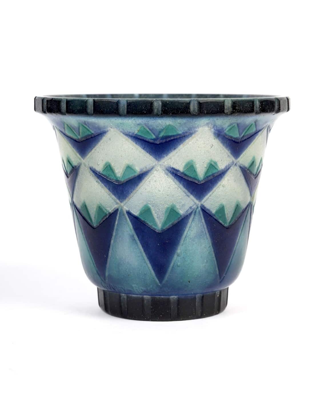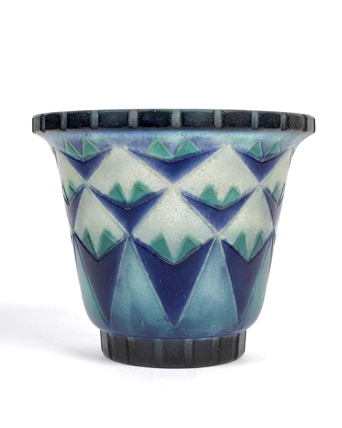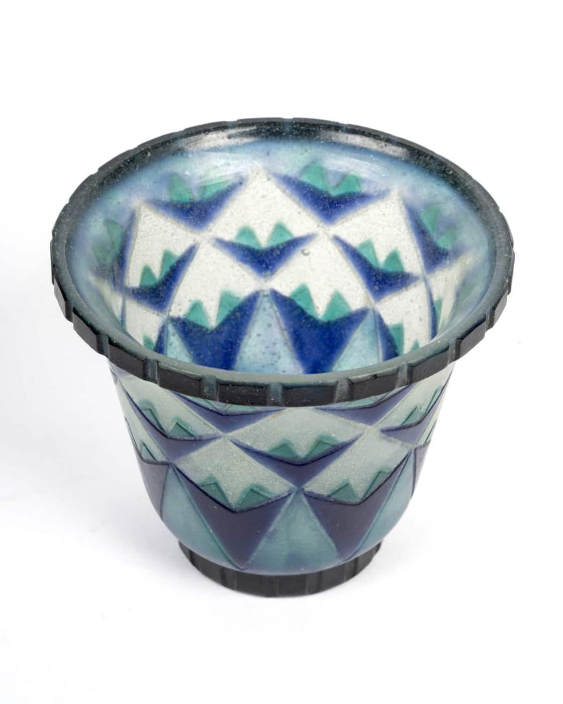 Vase Arts Deco « Palmettes Triangulaires » en pâte de verre blanche, verte et bleue créé par Gabriel Argy-Rousseau en 1930.