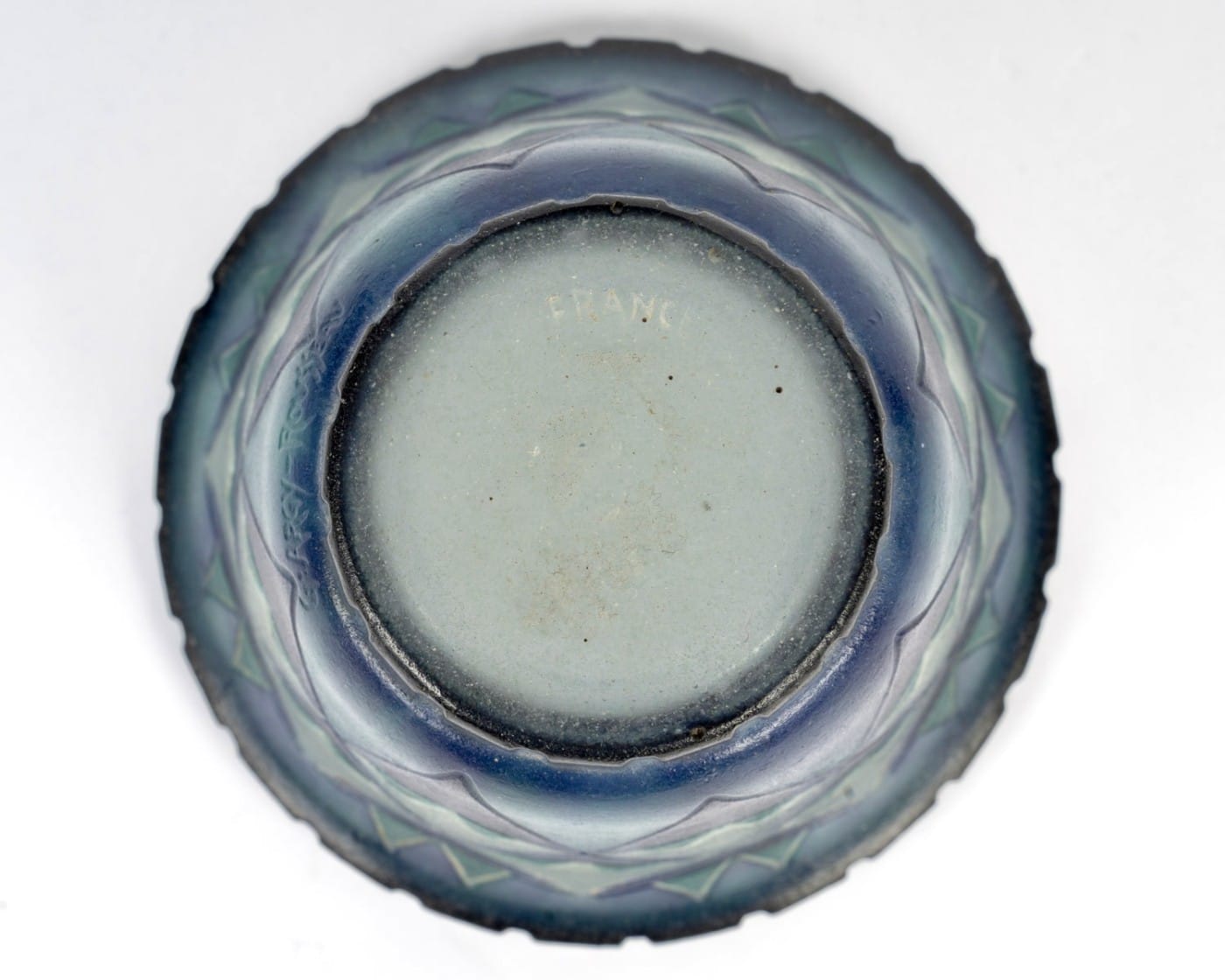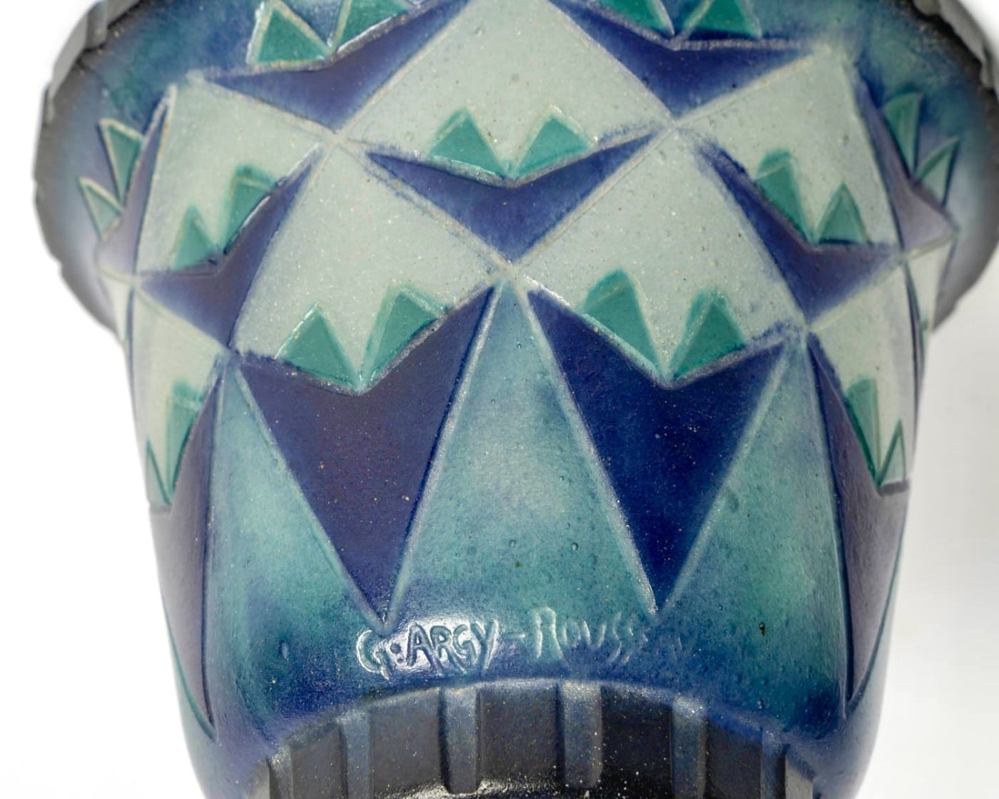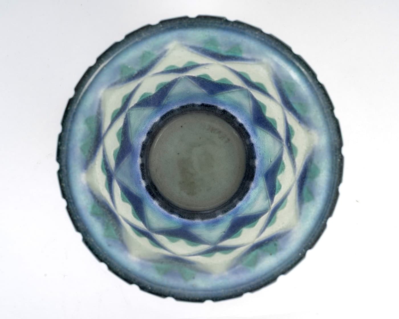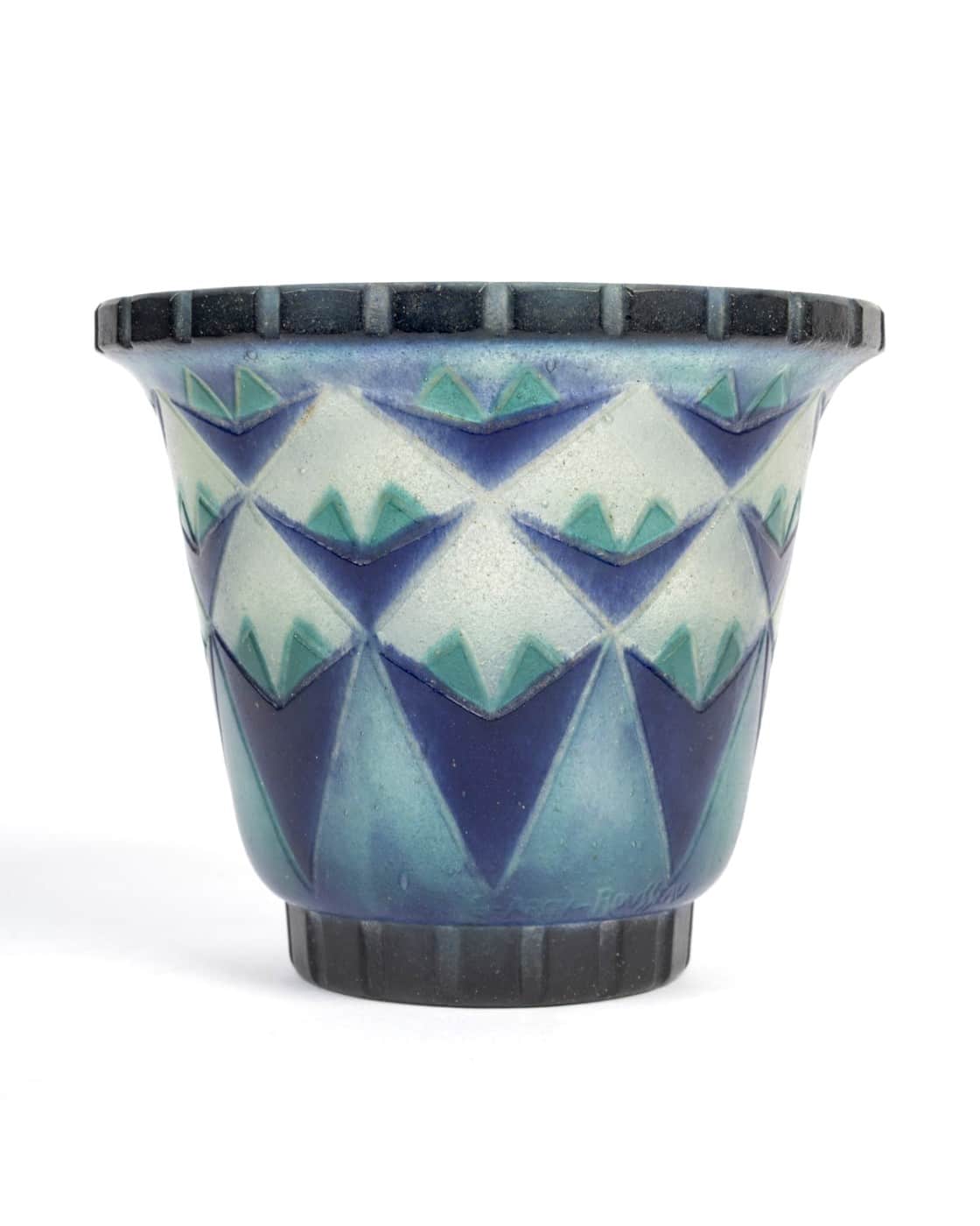 Vase Arts Deco « Palmettes Triangulaires » en pâte de verre blanche, verte et bleue créé par Gabriel Argy-Rousseau en 1930.