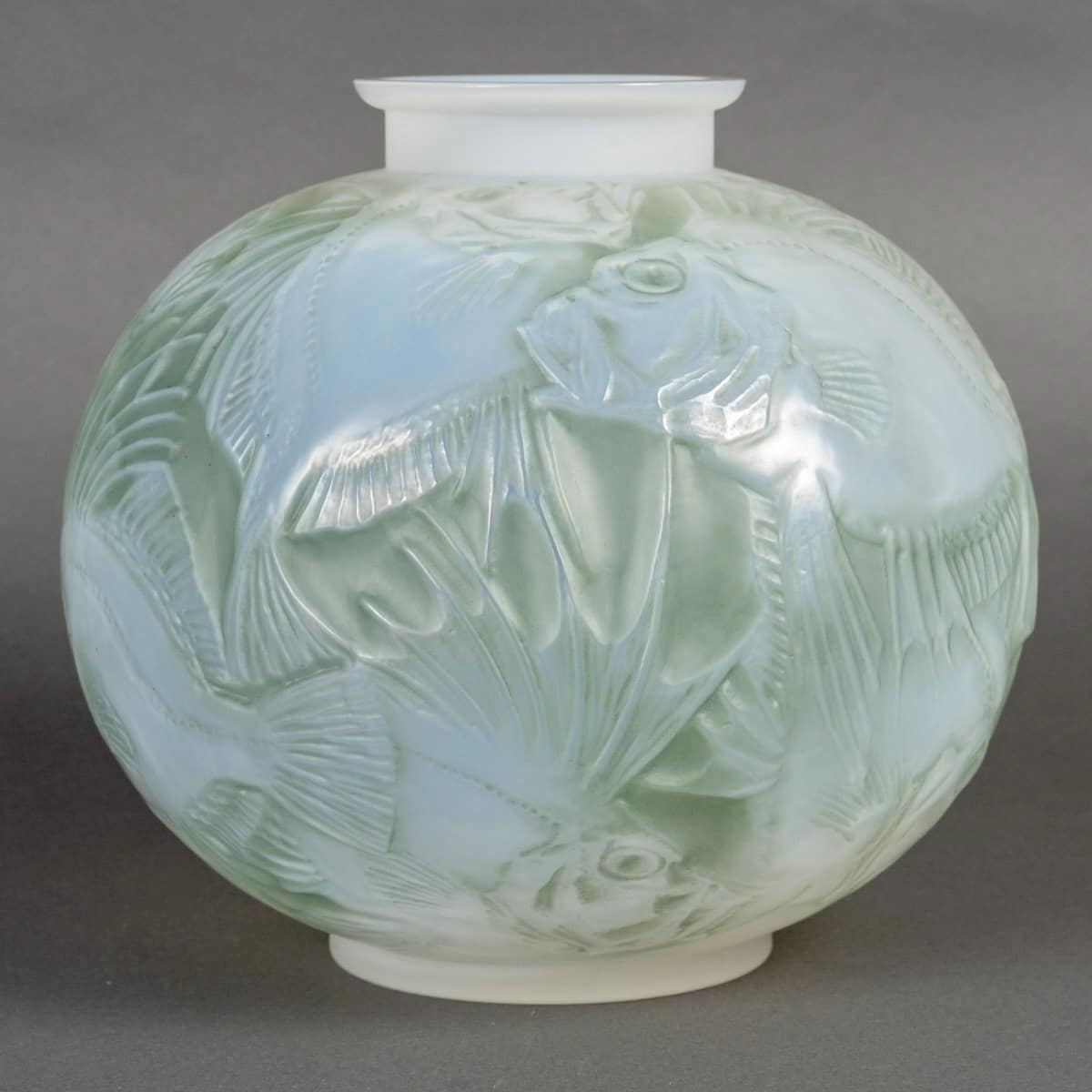 Vase « Poissons » en verre opalescent multicouche patiné vert créé par René Lalique en 1921.