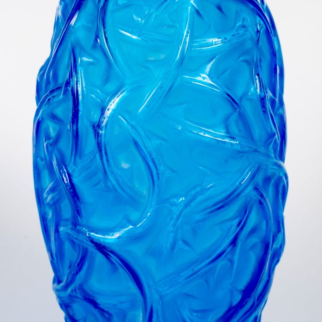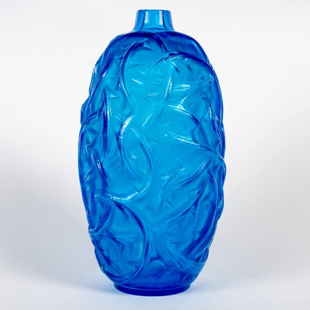 Vase « Ronces » en verre bleu électrique légèrement patiné blanc créé par René Lalique en 1921.