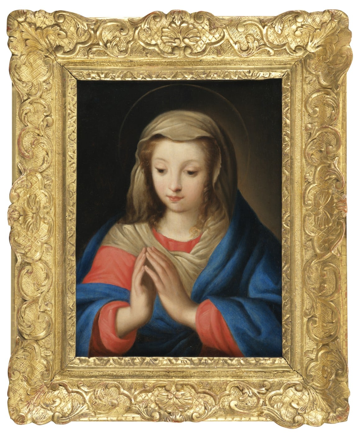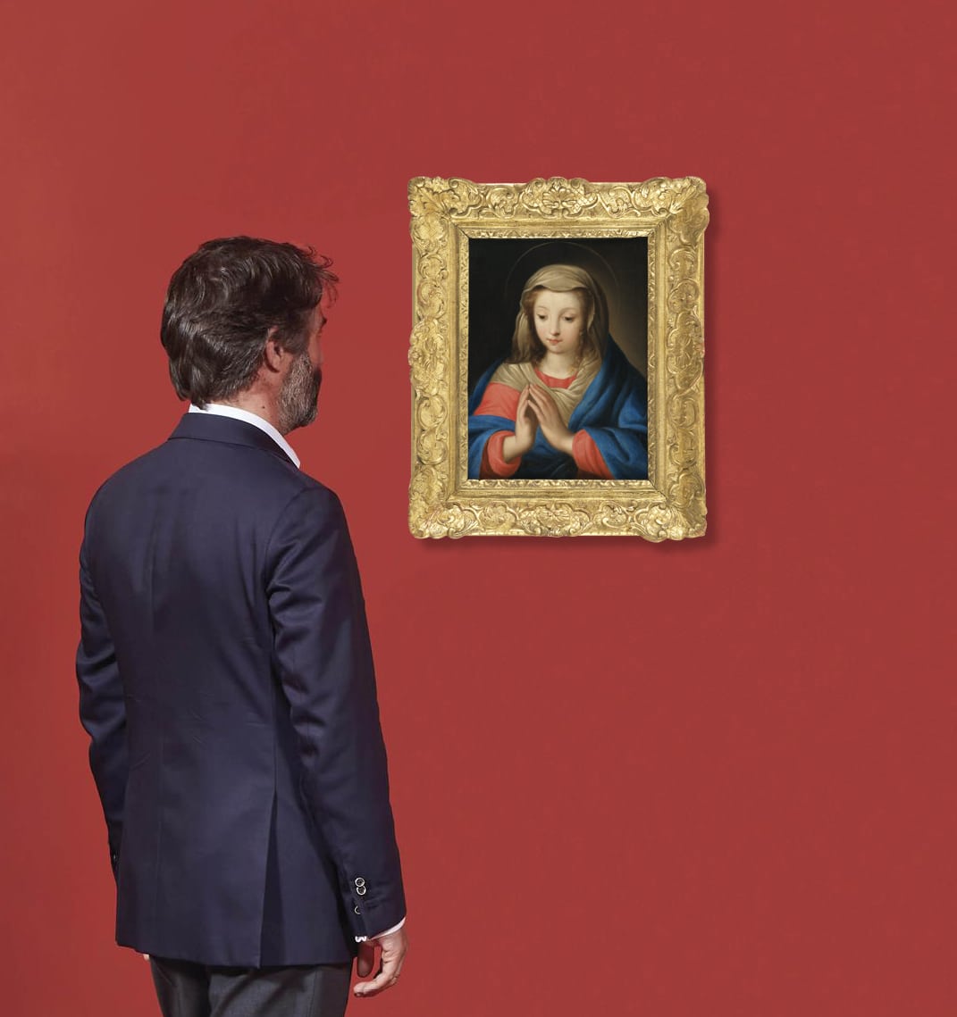 Notre composition s’appuie sur la très célèbre Vierge en prière de Giovanni Battista Salvi dit Sassoferrato (Sassoferato 1609 – Rome 1685) dont on connait de nombreuses versions, notamment celle conservée à la National Gallery de Londres qui présente un cadrage similaire à la nôtre. Avec beaucoup d’audace, notre peintre s’acquitte de la facture originale pour nous offrir une vision totalement nouvelle. Sa manière de jouer avec la couleur et la lumière fait irradier une douceur ineffable de sa Vierge au visage poupin et dont les traits se perdent dans une peinture en sfumato. Ces procédés ne sont pas sans rappeler l’œuvre du génie d’Urbino Federico Barocci (Urbino 1535 – Id. 1612). Et si nous ne connaissions pas l’œuvre de Sassoferrato, nous serions tenté de classer cette peinture de dévotion comme l’ouvrage d’un artiste de la suite de Federico Barocci. En conclusion, comme un véritable hommage aux deux artistes « marchigiani », notre peintre a subtilement emprunté l’art de chacun d’entre eux pour renouveler une œuvre iconique.