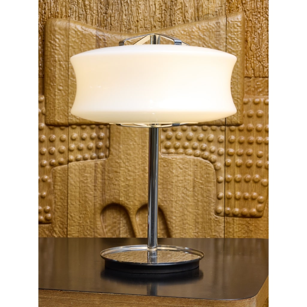 Vintage table lamp, ideal for a desk, made of a steel base and an opaline glass shade suspended by a cross bracket.