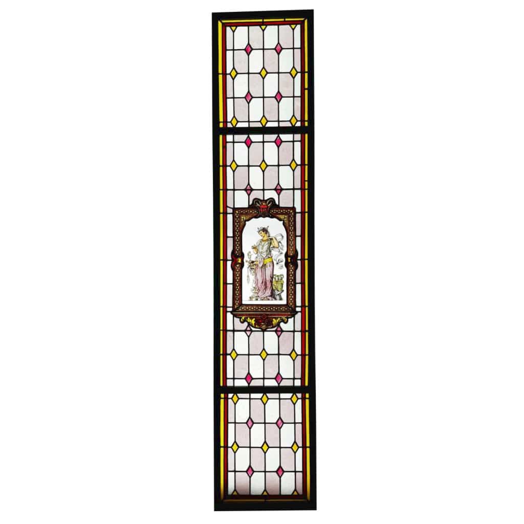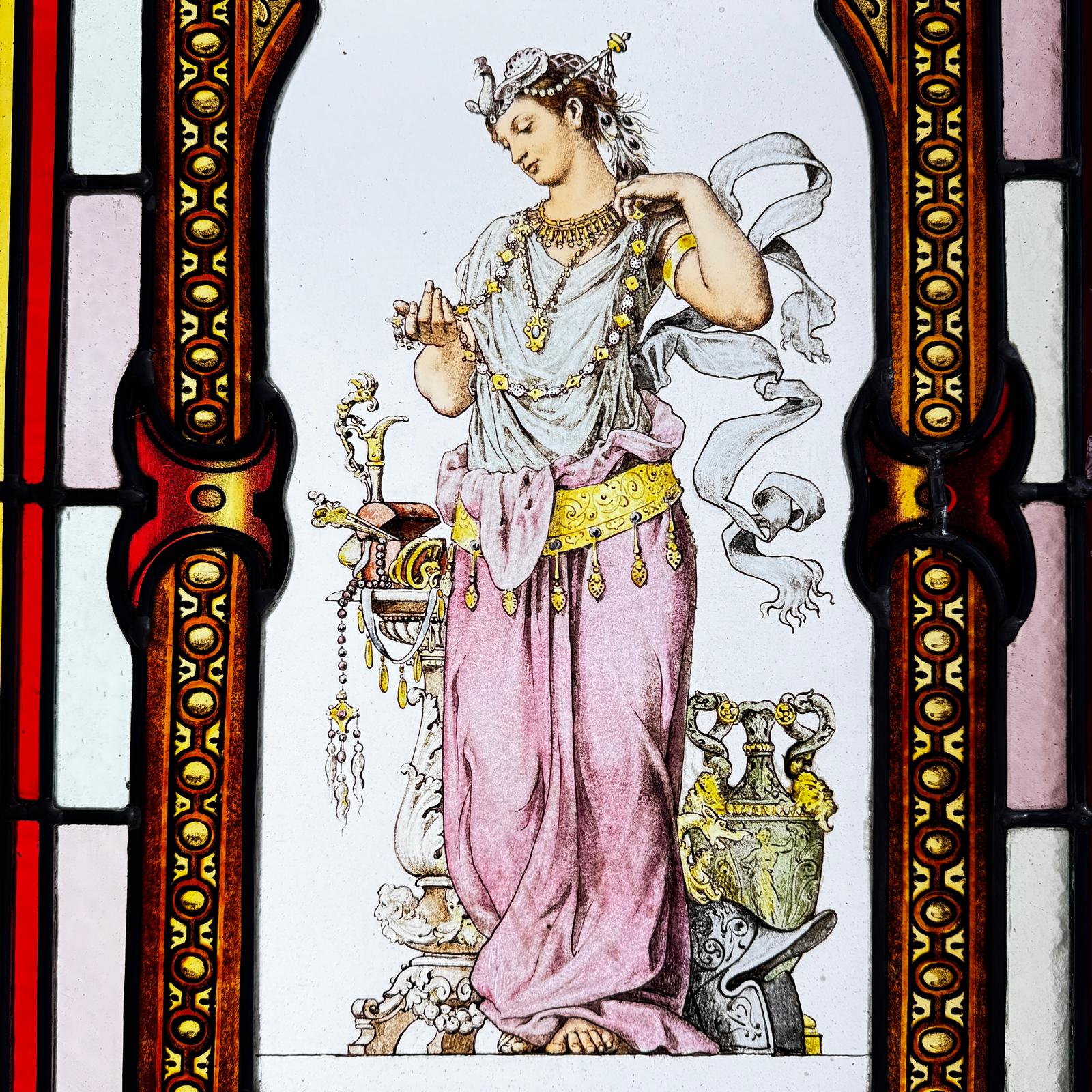 Vitrail représentant en son centre, peint en grisaille et aux émaux sur verre lisse, une jeune femme richement parée colliers, ceinture à pampilles se tenant debout à côté d’une amphore et d’une “colonne” supportant un narguilé. Elle est coiffée d’une parure à tête de paon, à ses pieds se trouve un casque. La figure féminine est au centre d’un cadre travaillé et surmonté d’une tête à cornes. Le fond du vitrail est à damiers en verre cathédrale avec cabochons dans les tons de rose et jaune, deux filets : un rouge et un jaune encadrent le vitrail.