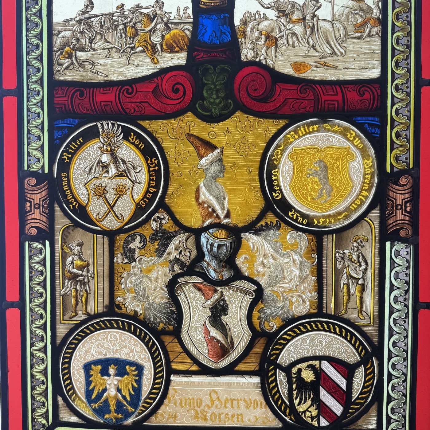 Vitrail d’époque XIXe dans l’esprit de la Renaissance, peint en grisaille et aux émaux avec de nombreux détails : blasons, personnages, scènes de tournoi chevaleresque