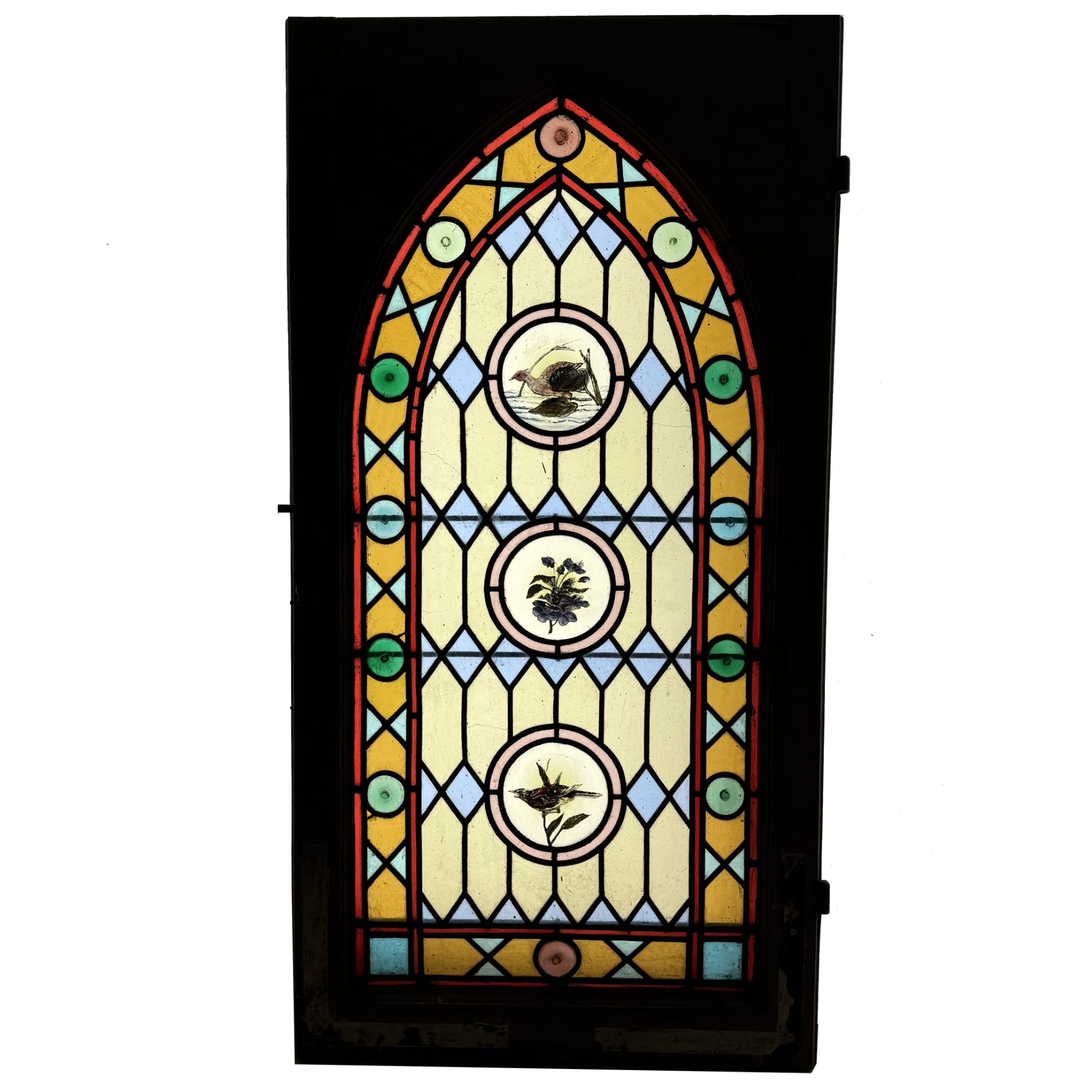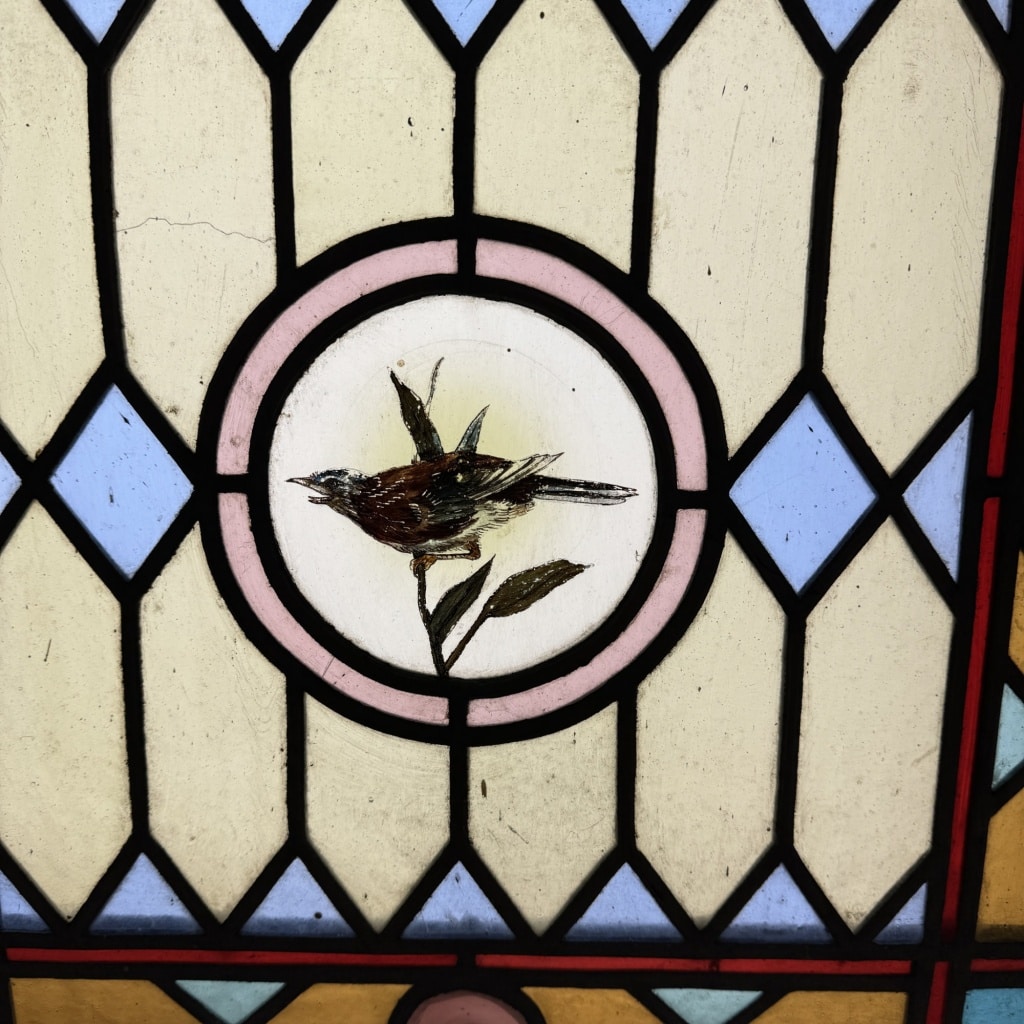 Vitrail multicolore en forme d’ogive dans un chassis chêne mesurant 108 cm de haut et 56 cm de large.
