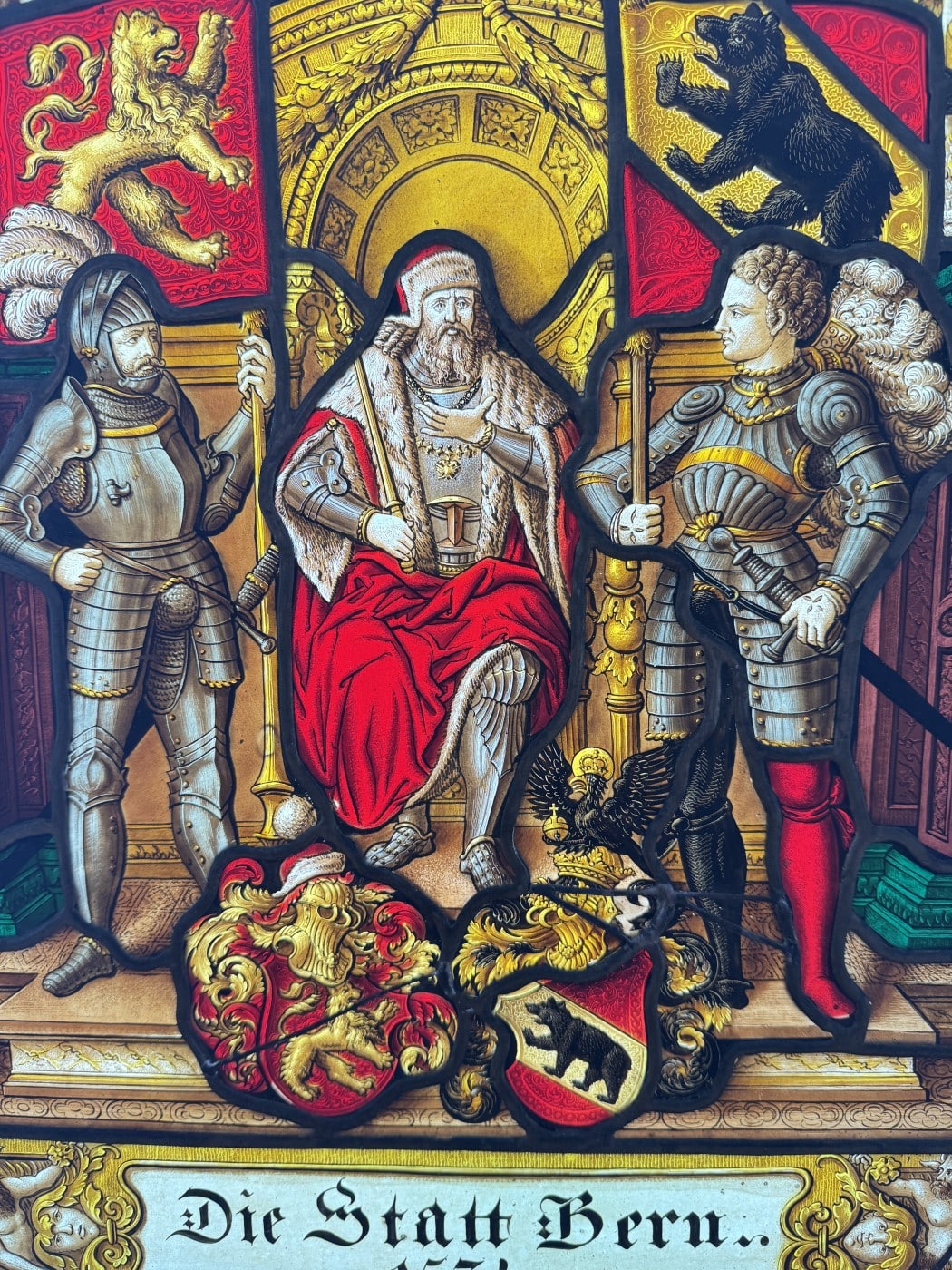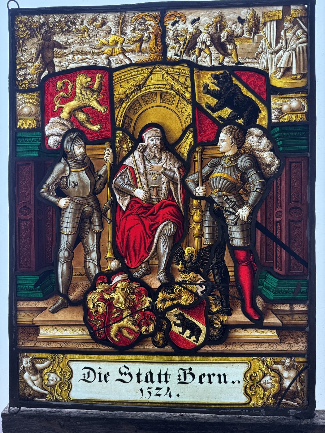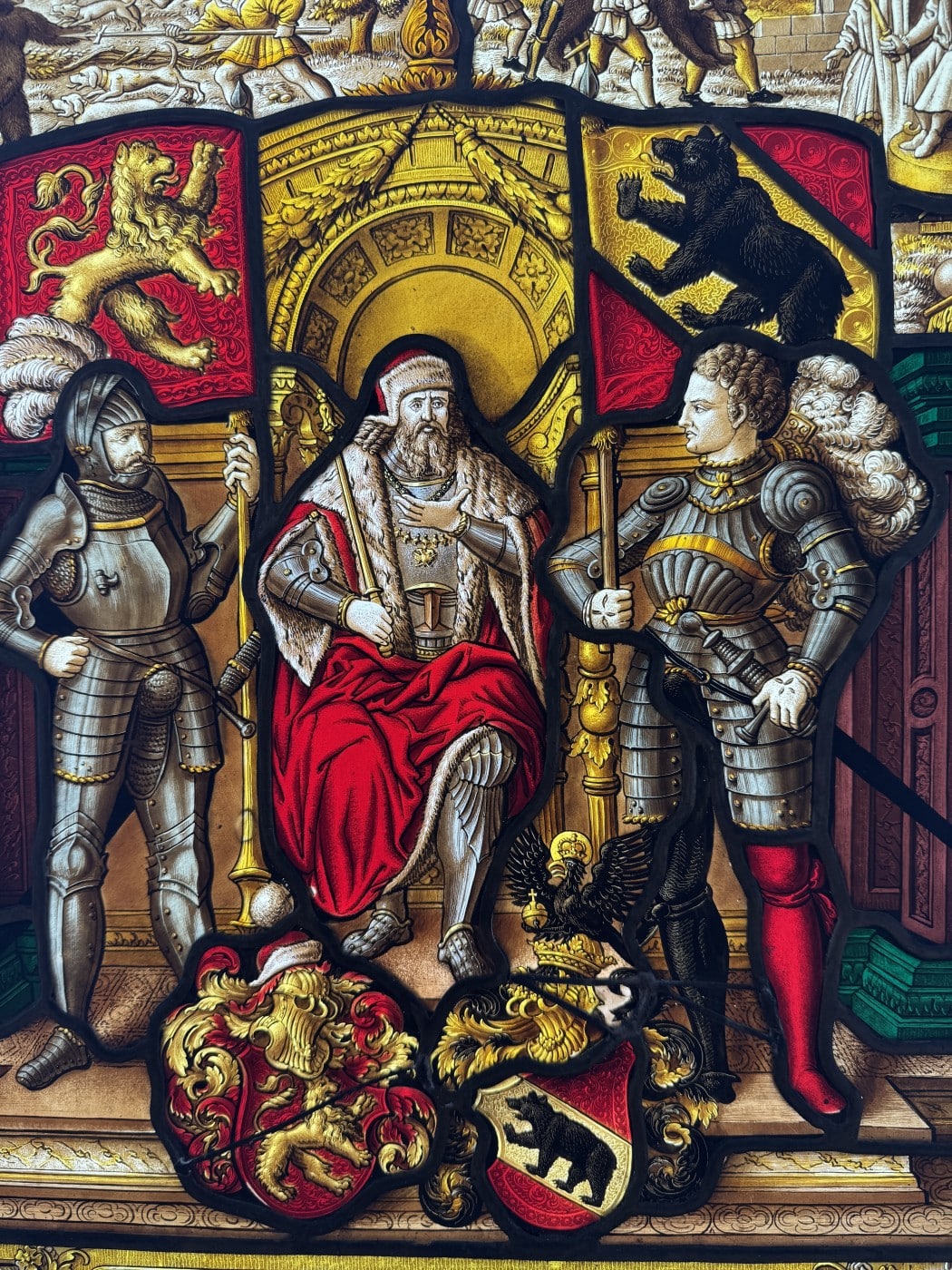 Vitrail de style renaissance peint en grisaille et aux émaux représentant le duc Berchtold V de Zähringen, fondateur de la cité de Bern qui aurait abattu selon la légende un ours sur le lieu d’implantation de la ville.