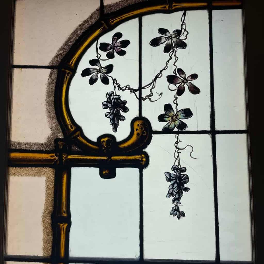 Vitrail signé J-A Ponsin en verre cathédrale, peint en grisaille et aux émaux, représentant un enfant chassant le papillon. A l’intérieur du pourtour stylisant du bambou, le verre cathédrale est translucide. Dans la partie supérieure, des branches de clématite et une chenille devenant papillon. Bordure légèrement teintée.