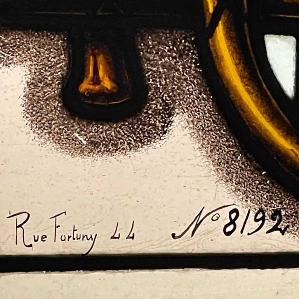 Joseph-Albert Ponsin (1842-1899) surnommé le « Vitrarius », comédien et auteur de chansons, devient un maître verrier reconnu dans le dernier quart du XIXe. Il a notamment créé des vitraux pour l’hôtel particulier de Sarah Bernhardt, rue Fortuny. En 1879, Joseph-Albert Ponsin commande à Alfred Boland un hôtel particulier de style néo Renaissance au 42 de cette même rue. Spacieux, l’hôtel concentrait plusieurs fonctions avec des espaces habitables, l’atelier et les espaces d’exposition. L’adresse mentionnée sur le vitrail : 44, rue Fortuny, est celle du chanteur d’opéra bouffe Soto.