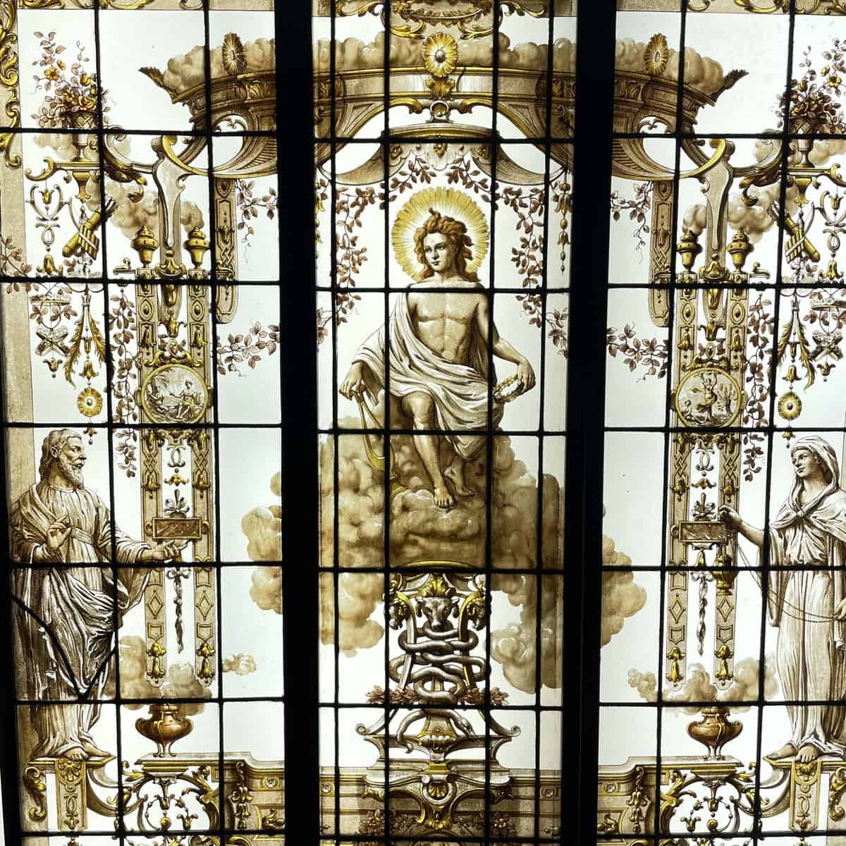 Vitraux en 3 parties en verre lisse transparent, peints en grisaille et au jaune d’argent, représentation à l’antique dans l’esprit du XVIIe : au centre, sous un élément architectural décoré de guirlandes végétales, Apollon (avec ses attributs : lyre et couronne de laurier) dieu grec des arts, de la beauté masculine, du chant, de la musique et de la poésie en majesté trônant sur des nuées et de part et d’autre, un homme et une femme. Des médaillons évoquent des scènes mythologiques (Daphné se transformant en laurier, Apollon luttant contre le serpent Python, …).