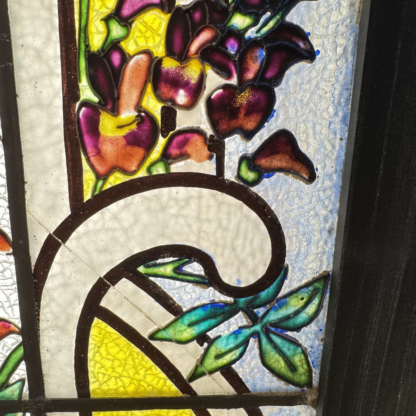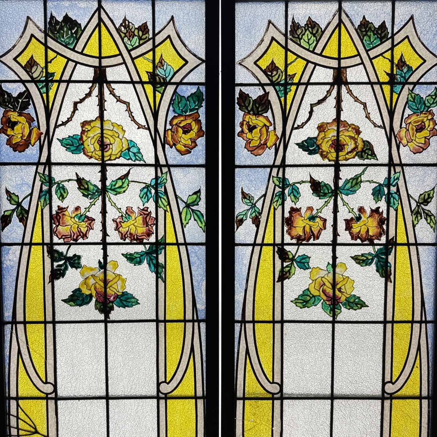 Paire de vitraux Art Nouveau aux arabesques dans les tons jaune. Dans la partie supérieure des roses, dans la partie inférieure des lupins. Technique d’émaux cloisonnés. Châssis en bois.
