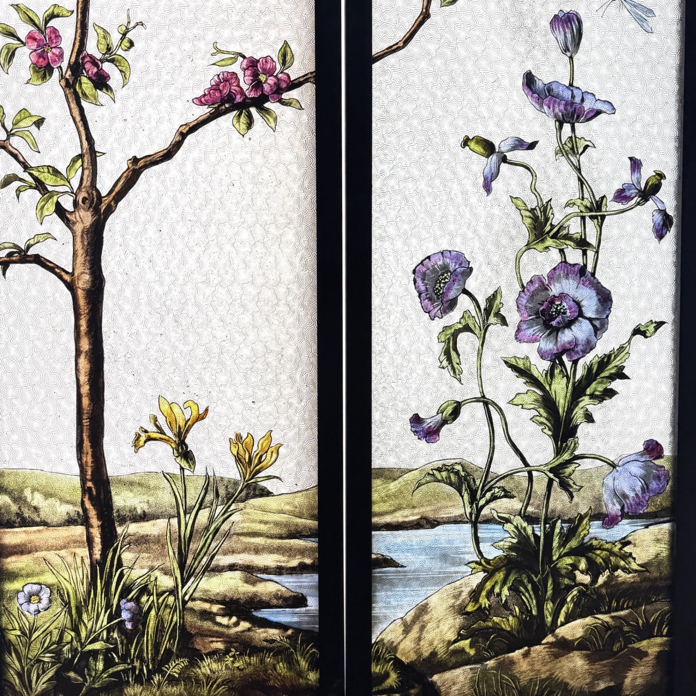 Paire de plaque de verre imprimée, peint en grisaille et aux émaux représentant un scène de bord d’étang avec au premier plan une fleur de pavot avec une libellule, un iris et un pommier du japon. En arrière plan un étang entouré de colline verdoyante.