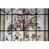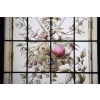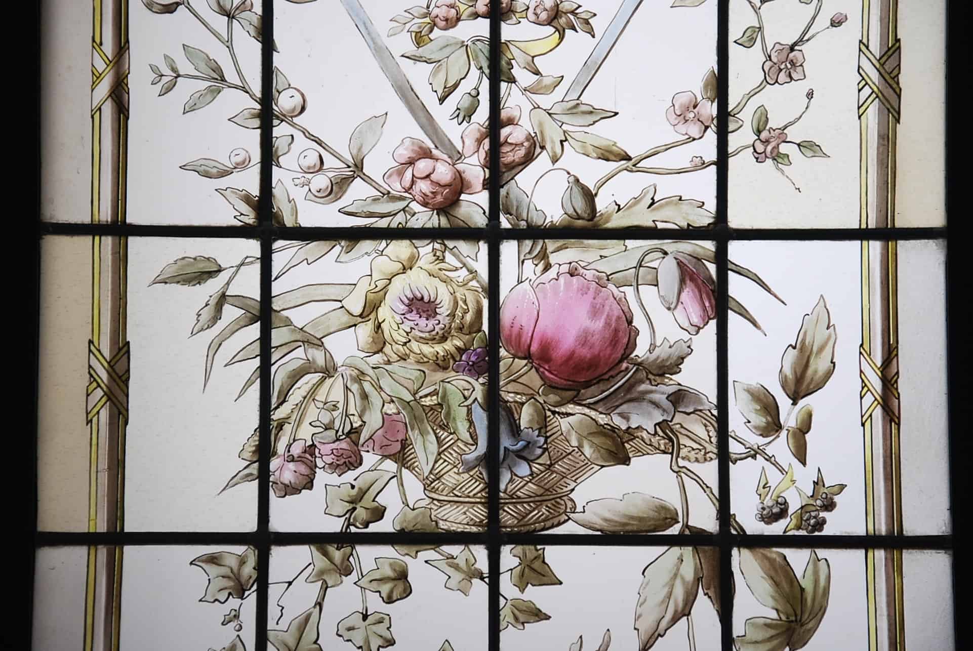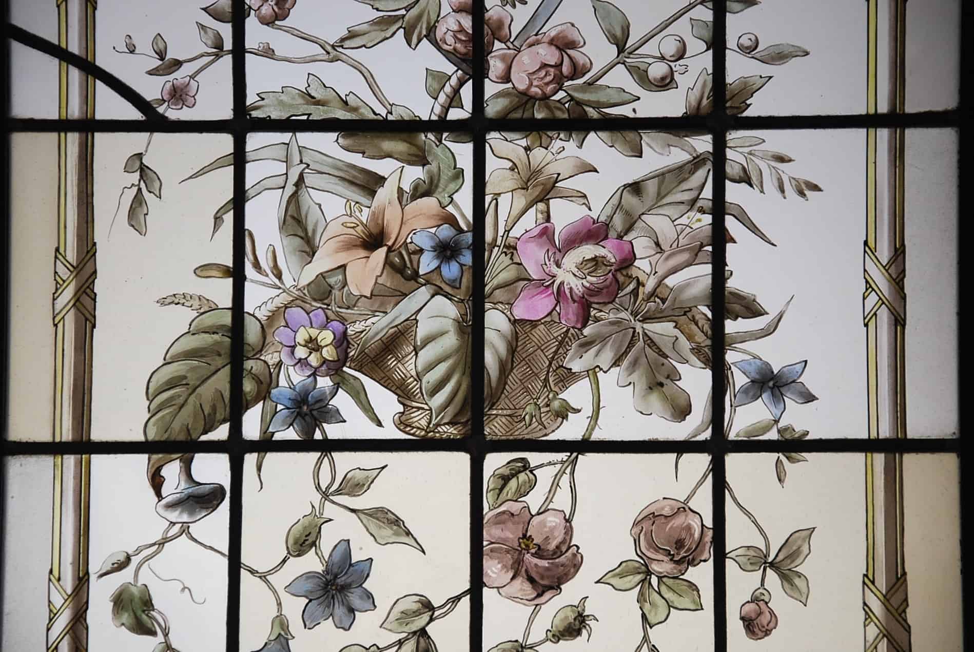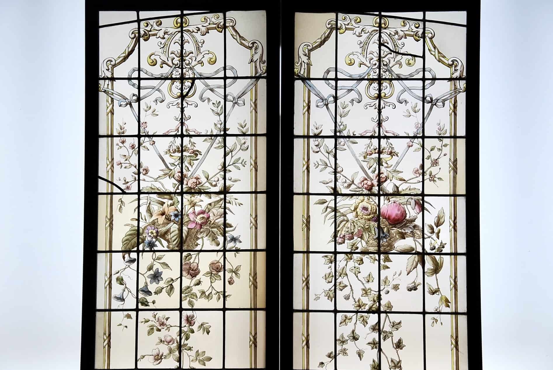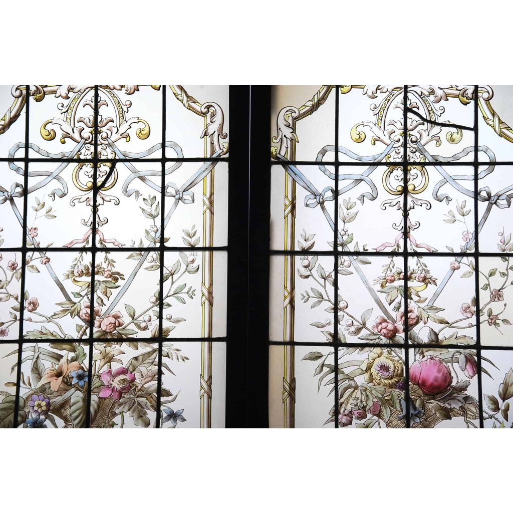Paire de vitraux aux paniers fleuris suspendus à un ruban bleu avec une bordure à rubans croisés, décors de rinceaux au jaune d’argent peint en grisaille et aux émaux sur verre lisse transparent légèrement teinté. En parfait état, remise en plomb totale, châssis en bois.