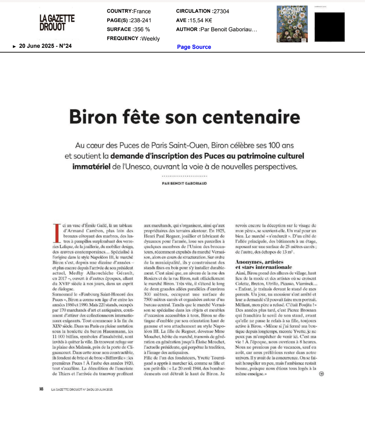 Au cœur des Puces de Paris Saint-Ouen, Biron célèbre ses 100 ans et soutient la demande d’inscription des Puces au patrimoine culturel immatériel de l’’Unesco, ouvrant la voie à de nouvelles perspective