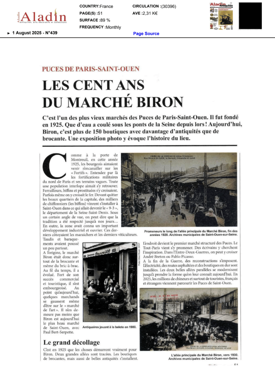 C’est l’un des plus vieux marchés des Puces de Paris-Saint-Ouen. Il fut fondé en 1925. Que d’eau a coulé sous les ponts de la Seine depuis lors ! Aujourd’hui, Biron, c’est plus de 150 boutiques avec davantage d’antiquités que de brocante. Une exposition photo y évoque l’histoire du lieu.